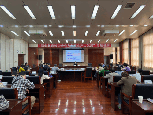 4月16日下午,必赢76net线路官网综合楼11楼会议室举办“职业教育校企合作与新质生产力发展”专题讲座,东南大学经济管理学院梅姝娥教授应邀来校授课。学校组织人事处、教务处、招生就业处、科技处等部门正副职,各二级学院党政负责同志、系主任、专业负责人等聆听了讲座,讲座由安徽滁州职教集团副秘书长、必赢76net线路官网招就处副处长周多道主持。
