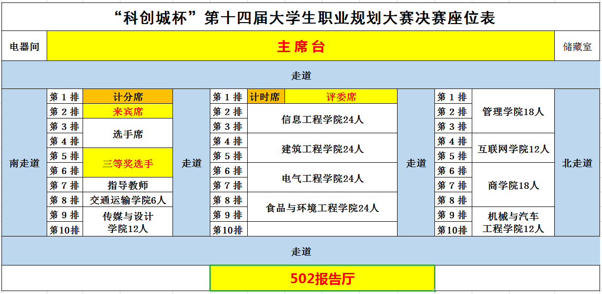 “科创城杯”第十四届必赢76net线路官网大学生职业规划大赛决赛将于12月4日(星期三)下午3:00在5楼报告厅举办,请各院按要求组织学生观众到现场观摩。请所有参与人员2:20—2:50入场并到指定位置就座(座位表附后)。