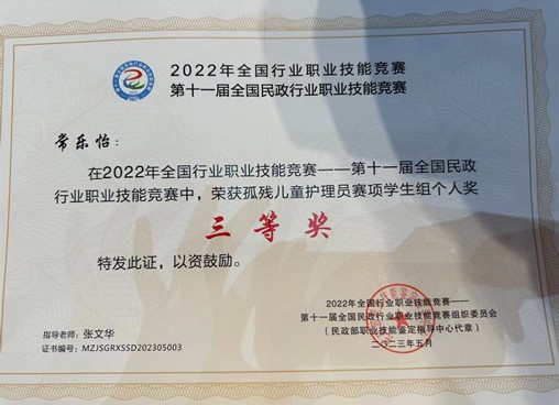5月24日,2022第十一届全国孤残儿童护理员职业技能竞赛决赛在安徽省蚌埠市中共蚌埠市委党校落下帷幕。集团副理事长单位滁州城市职业学院护理学院学生常乐怡同学表现出色,荣获大赛三等奖。祝贺!