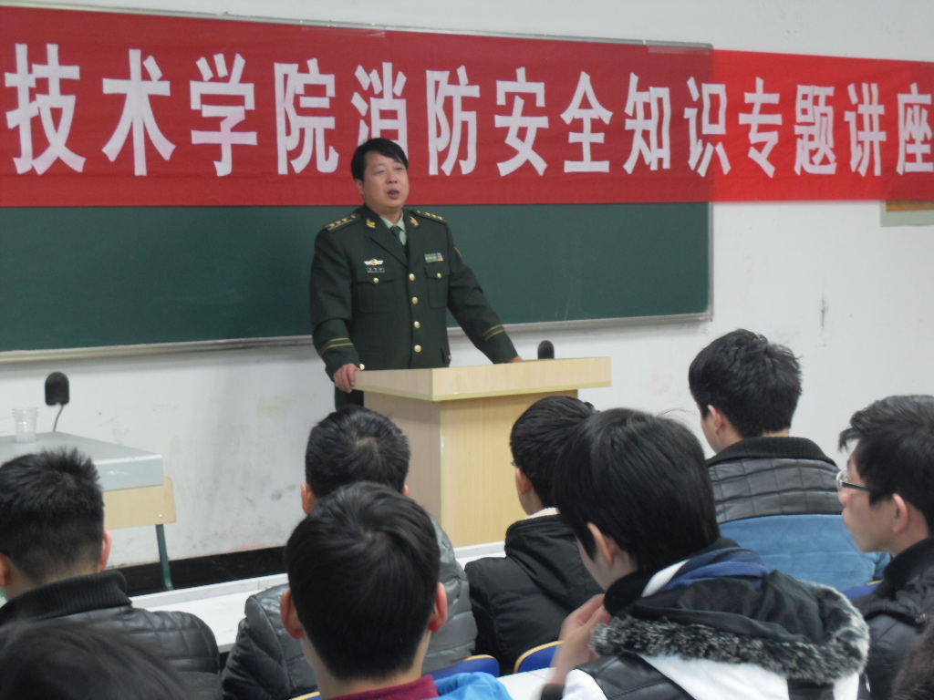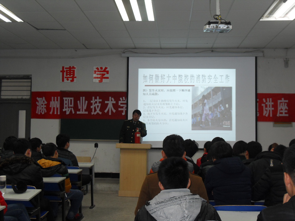 为进一步提高我院师生员工预防火灾和火场逃生自救能力和消防安全意识。2014年12月24日下午,学院保卫处邀请了滁州市消防支队防火处宋建新处长来院进行消防安全知识讲座,机电工程系师生参加了讲座。