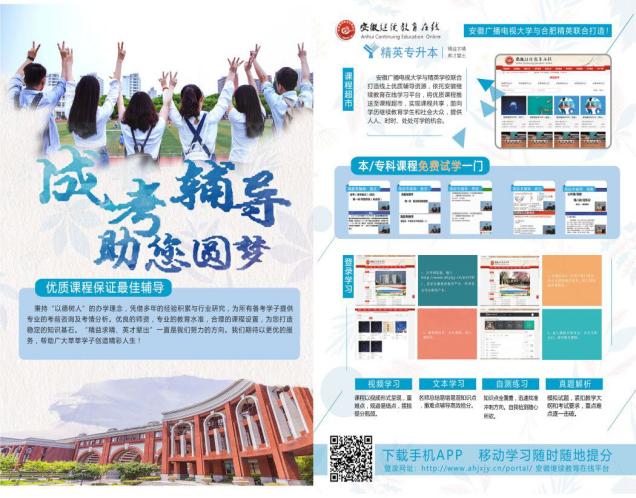 2019年10月成考在即,为更好地服务学生,安徽继续教育网络园区提供了优质成考线上辅导资源,帮助学生顺利通过成人高考,助力圆梦。辅导资源优质全面,学习方式高效灵活,网络辅导课程包括:语文、数学、英语、政治、高数,本专科全覆盖。