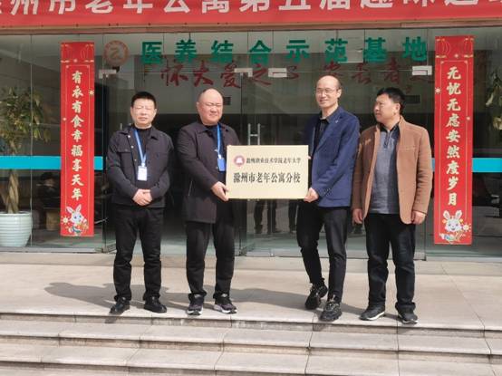 2023年3月9日上午,继续教育学院院长、老年大学常务副校长一行前往滁州市老年公寓,为老年大学市老年公寓分校挂牌、并给公寓负责人邵国庆院长颁发了分校校长聘书。