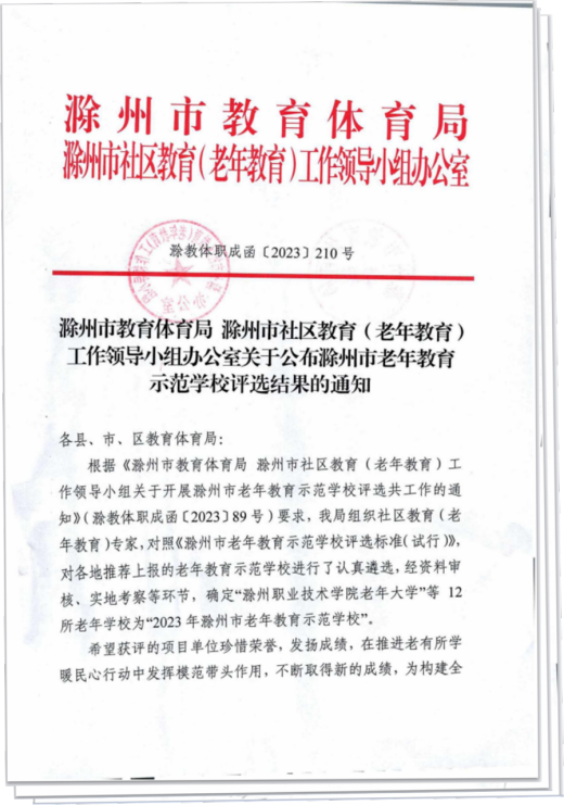 付出不为回报,但付出总有回报。2023年7月,我老年大学被滁州市教体局、滁州市社区教育(老年教育)工作领导小组办公室评为2023年滁州市老年教育示范学校。老年大学会以此为勉、再接再厉,做出更大的贡献。