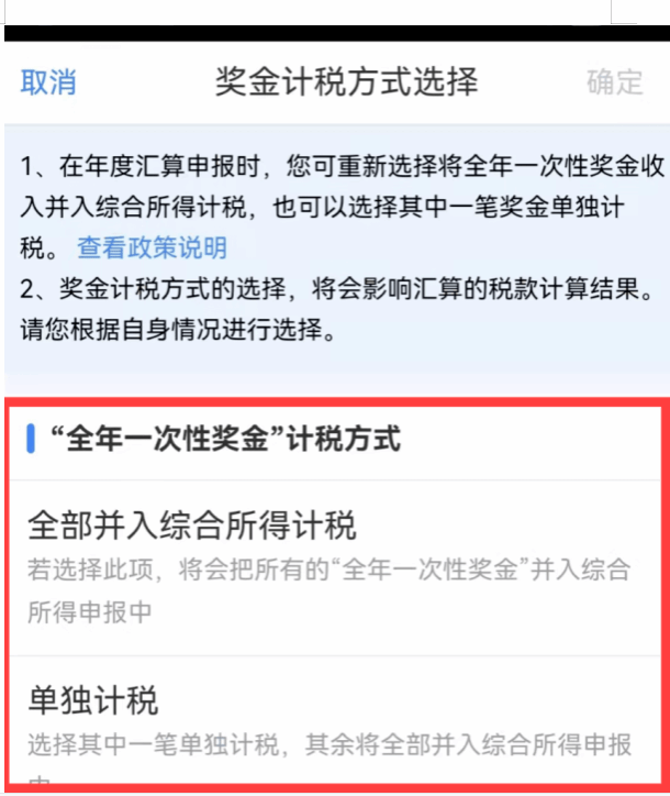具体方法为:点击“工资薪金(存在资金,请在详情中进行确认)”进入【奖金计税方式选择】,可选择【全部并入综合所得计税】或选择【单独计税】,点击【确定】后返回申报界面再点击【下一步】查看计税结果。