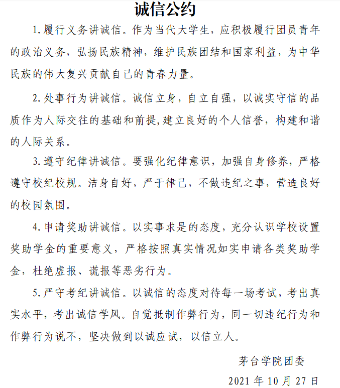 《诚信公约》以履行义务讲诚信、处事行为讲诚信、遵守纪律讲诚信、申请奖助讲诚信、严守考纪讲诚信五个方面践行诚信规范,作为同学们今后学习生活中的基本准则。