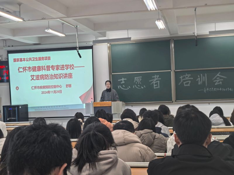 为进一步宣传和普及艾滋病防治知识,增强同学们的防艾意识,至此在第37个世界艾滋病日之际,青年志愿者协会(红十字会)联合仁怀市红十字会、仁怀市疾病预防控制中心举办了“Beat365中文官方网站青年志愿者协会培训之预防艾滋病讲座”。本次讲座由疾控中心副主任舒丽主讲,全体志愿者参加。