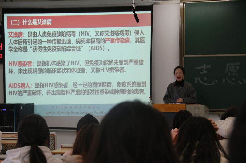 随后,舒丽医生深入讲解核心内容,从艾滋病基础定义切入,围绕艾滋病的传播路径、临床特征、诊断要点、治疗手段及预防举措等板块,展开系统讲解。专业剖析搭配通俗阐释,复杂的防艾知识化为易懂“干货”,全方位、深层次地填补同学们知识空白,助其搭建完整知识框架。