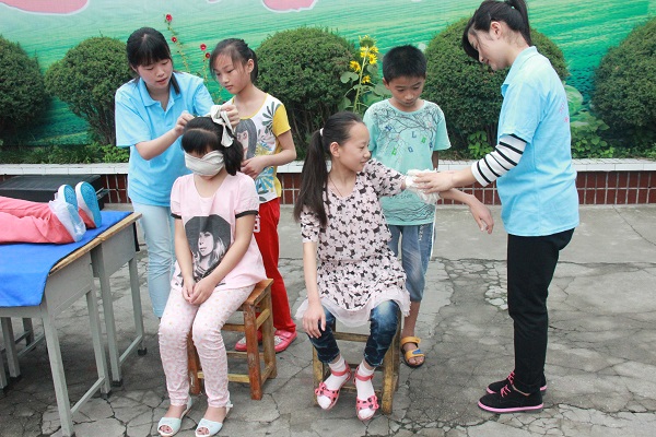 6月24日下午,在院团委副书记刘杰的带领下,我院暑期社会实践小分队来到滁州市博士小学开展了“应急救护知识”宣传、培训活动。社会实践小分队的志愿者首先进行应急救护的宣传并给小朋友们讲解有关应急救护方面的知识,然后教他们怎样进行简单的眼部和肘部伤口包扎以及心肺复苏的正确处理方法。为了让小学生们对本次应急救护模拟活动印象更加深刻,在互动环节,让小学生们亲自操作,使他们对生活中的急救方法更深入了解,紧急时刻可以自救、互救。