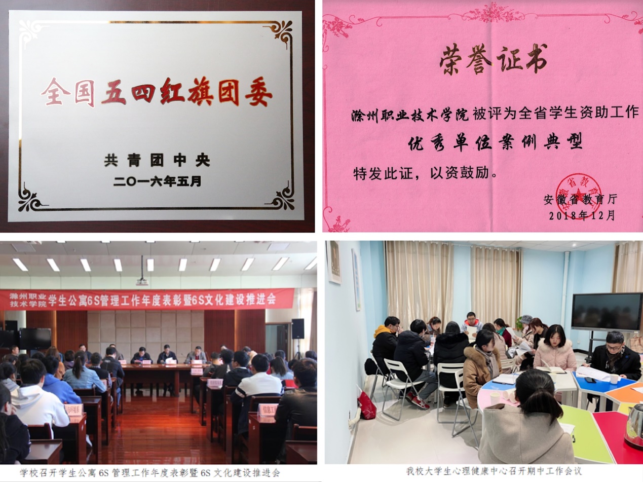 落实立德树人任务,文化育人成效显著。以习近平新时代中国特色社会主义思想为指导,以弘扬“社会主义核心价值观”系列活动为载体,着力构建“三全育人”格局,引导学生树立正确的世界观、人生观和价值观。原机电系2013级机电1班团支部和团支部书记赵蕴阳同学分别获得“全国践行社会主义核心价值观示范团支部”和“全国百佳团支书”称号。谢丽丽、李晓辕、刘娟获“全省高校优秀辅导员”称号,校团委获“全国五四红旗团委”称号,学校获安徽省第四批“三全育人”试点建设高校。构建了“一训三风”的学校文化体系,成功举办“第五届中国高等职业院校健美操锦标赛”“安徽省十五运”等全国性体育赛事和全国第八届农民歌会开幕式,举办大学生社团文化节、道德文化讲堂等校园文化活动,积极打造和乐文化、“小青亭”志愿者服务队等特色校园文化品牌,学校连续两届获“安徽省文明单位”称号。