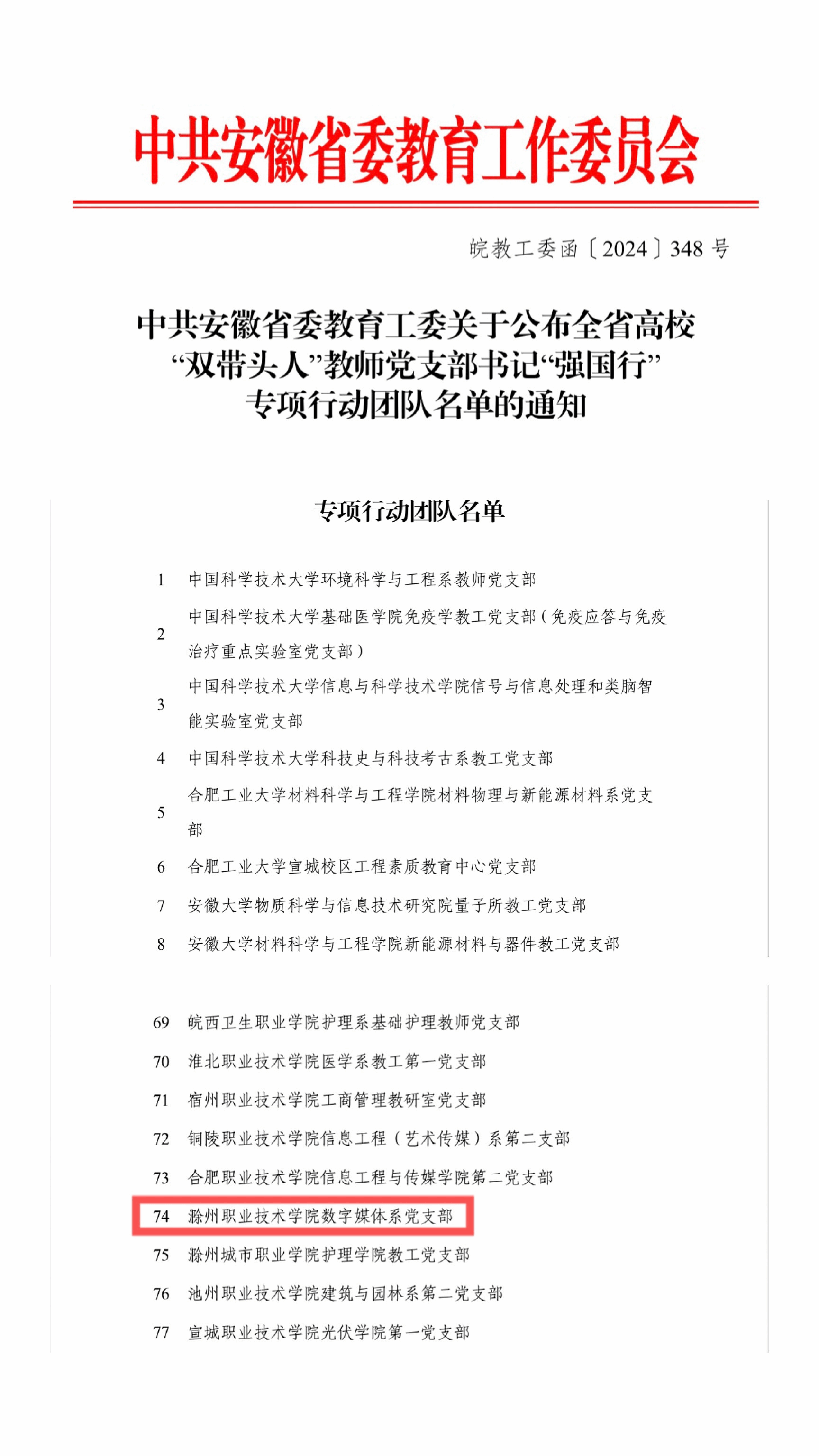 近日,中共安徽省委教育工作委员会公布了全省高校“双带头人”教师党支部书记“强国行”专项行动团队名单,必赢官网传媒与设计学院数字媒体系党支部成功入选,实现了学校党建“双创”工作新突破。