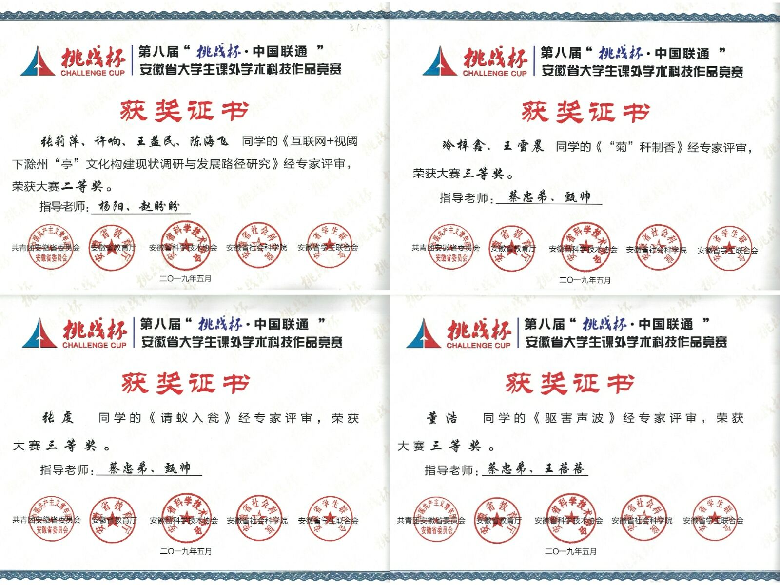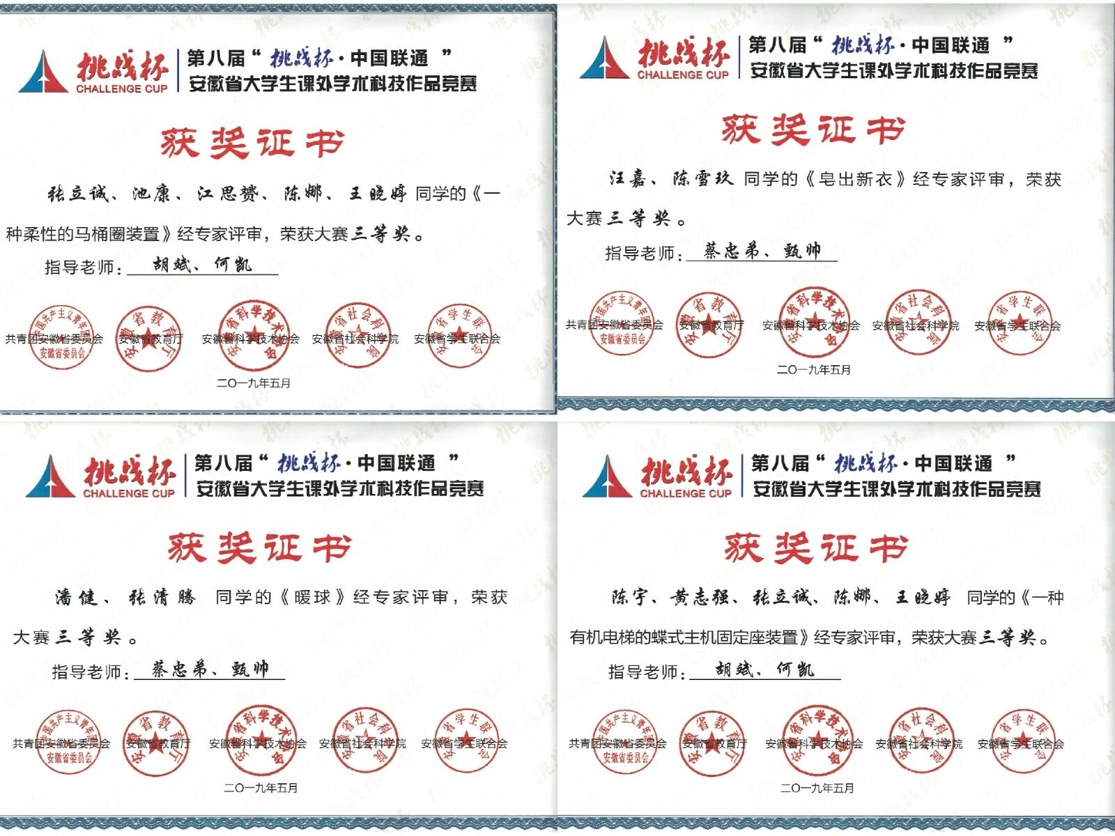 为了推动大学生创新创业素质教育,全面提高学生综合素质,充分展示学生风采,营造良好的校园文化氛围,5月27日,安徽省第八届“挑战杯·中国联通”大学生课外学术科技作品竞赛在合肥工业大学圆满落幕。必赢官网8件作品成功获得高职组创意设计竞赛奖项。