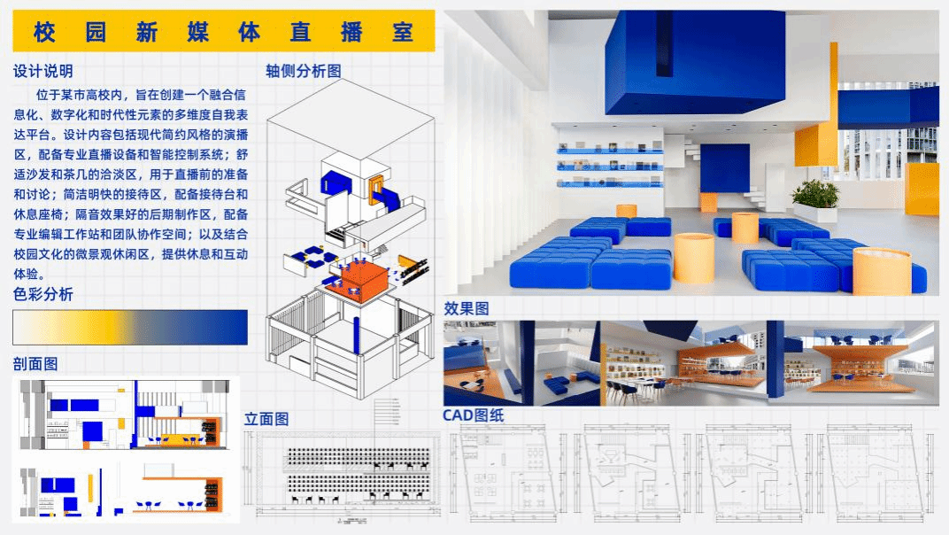 本次毕业设计以“点亮阅读之灯·开启数字未来”为主题,进行校园新媒体直播室设计,主题鲜明,个性突出,紧随当下时代前沿,探索大学生多元化共享空间设计。参与答辩的同学们准备充分,通过PPT演示与展板,自信满满地展示自己的设计作品,详细阐述设计理念、风格定位、设计过程及最终成果。各位专业指导教师首先对每位学生的设计作品给予了充分的肯定,同时,针对每个方案进行提问和点评,在设计亮点、室内设计制图规范、材料工艺选用等多方面与同学们展开了深入的交流和探讨。学生们仔细聆听并认真回答,表示针对存在的问题会进一步优化完善。指导教师们的精彩点评和合理建议让参加答辩会的同学们收获满满,中肯客观的点评,合理可行的建议,使学生们对设计有了更系统深入的认识,做到正确认知自我,见贤思齐,笃行不怠。