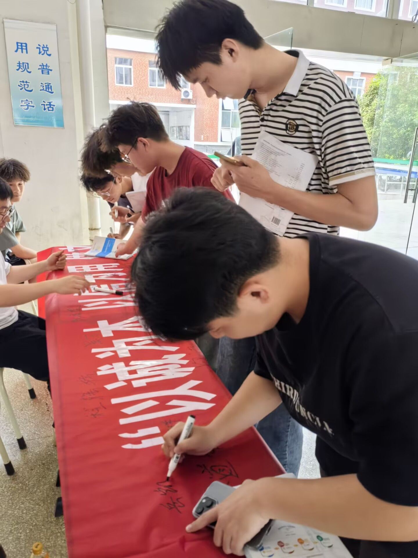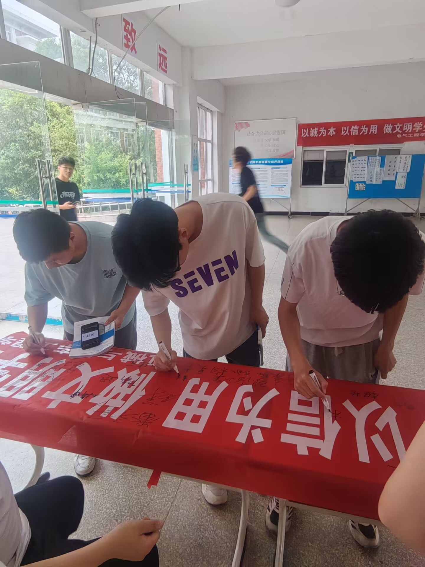 活动现场,学生们整齐列队,手持签字笔,在写有“以诚为本,以信为用,做文明人”的横幅上郑重签下自己的名字。他们的表情严肃而坚定,每一笔都承载着对诚信的承诺和坚守。
