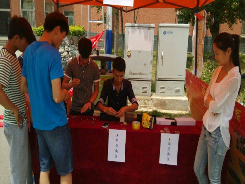 活动的内容主要是将同学们手中的一角、五角、一块的零钱换成整的。活动时间为正午,天气十分炎热,但这丝毫没有影响服务学生的工作态度,仔细的清点着同学们拿来的一毛一毛的零钱。在活动进行的过程中,还有不少的同学问我们这个活动开展几天,这说明了我们的此次活动获得了同学们的好评。