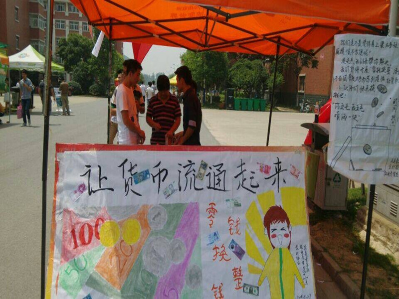 为了让货币流通起来,方便同学们的日常生活,5月28日中午11点半,机电系与求是青年社、会计协会在1号宿舍楼前开展了让货币流通起来——零钱换整钱活动。