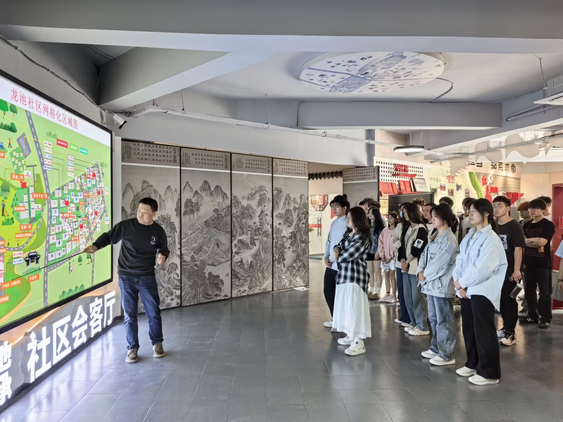 师生一行乘车刚到龙池社区门口,社区党委书记孙涛面带微笑快步向前热情接待前来参观调研的师生一行,并全程陪同讲解调研。首先,孙涛结合视频,给师生们详细介绍了龙池社区发展演变的过程和现在的基本情况:目前社区辖区面积2.1平方公里,16个居民小区,常住人口4330余户、1.4万余人,党员369名,志愿者1600余人。近年来,社区党委主动适应城市发展,结合地处老城中心现状,充分发挥党建引领作用,以社区“大党委”为抓手,探索形成“楼道板凳议事会”制度;以网格化管理为依托,推行“1+5+N”小区微治理工作法;以新时代文明站点为平台,设立“六色花”志愿者服务队;创新为民服务“新路径”,聚焦服务“一老一少”,实施“汉学堂”“国粹堂”“爱心学堂”“百家宴”等惠民项目,形成思想同心、目标同向、行动同力,建立共建、共治、共享的社会治理共同体,探索出龙池社区基层治理新模式。社区通过“强党建、抓治理、促和谐”,先后荣获全国最美志愿服务社区、全国先进基层群众性自治组织、全国“五四红旗团支部”、全国防灾减灾综合示范社区、安徽省省级智慧社区、智慧“139”工作法还获评安徽省省级优秀社区工作法等荣誉称号。