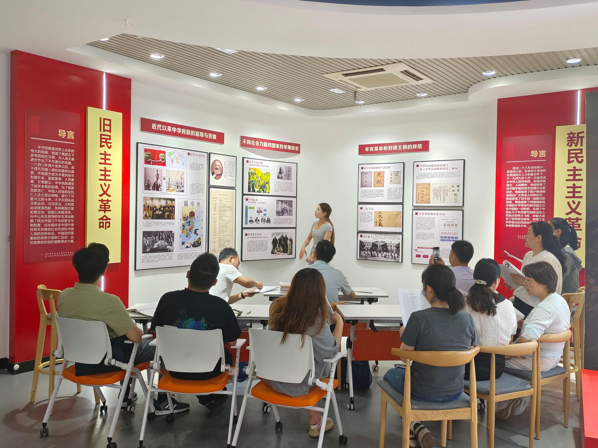 本次示范课充分利用思政场馆的现代化教学资源,创新采用“情境体验+互动研讨+现场汇报”的教学模式。课程伊始,孔金带领学生走进场馆,通过珍贵的党史图片、多媒体影像和VR设备,生动再现了中国共产党带领中国人民从站起来、富起来到强起来的伟大历程。这种沉浸式、体验式的教学方式,让抽象的理论变得可触可感,极大地激发了学生的学习兴趣。