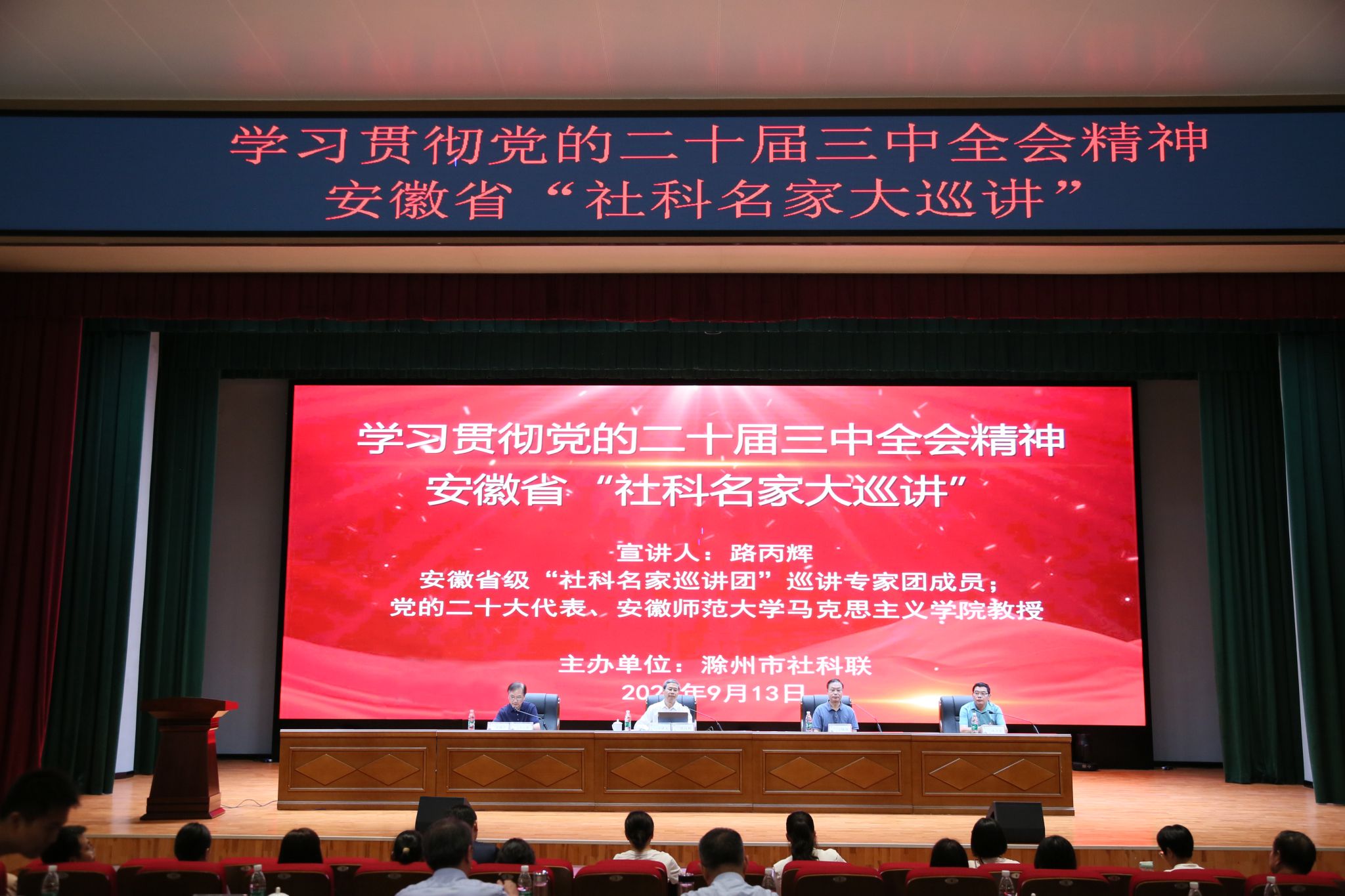 为进一步推进“大师进校园 名师进课堂”活动,根据上级有关工作安排,9月13日下午,学习贯彻党的二十届三中全会精神安徽省“社科名家大巡讲”走进必赢官网,此次宣讲由安徽省“社科名家大巡讲”巡讲专家团成员、党的二十大代表、安徽师范大学马克思主义学院教授路丙辉作宣讲报告,市委宣传部副部长、市社科联主席、一级调研员于晓波,市委讲师团团长、市社科联副主席林卫东,校党委书记曹付忠,党委副书记、校长许雪峰出席本次宣讲会。宣讲会由校党委委员、宣传统战部部长王冬主持。
