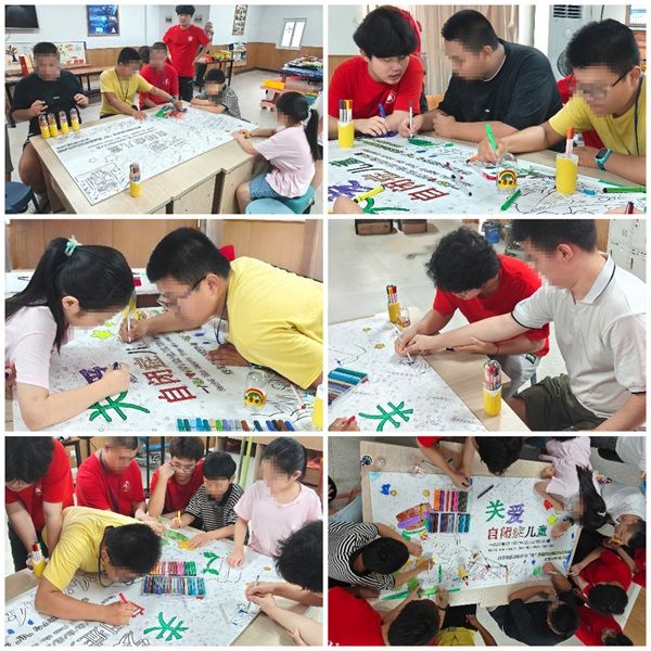 7月15日,“电”亮星空志愿服务队赴陈桥社区星未来孤独症康复机构,以趣味涂鸦的互动教学方式开展普通话推广的教学实践活动。活动伊始,我院志愿者以一对一的教学帮扶方式,指导星星孩子们在素描KT板上进行涂鸦填充。素描板上的内容为我院志愿者自主设计的“关爱自闭症儿童”动漫图片,“他们眼睛明亮,却不与你对视;他们虽有言语,却不与你交流;他们听得声响,却不与你互动;他们表达情绪,却不与你共情......”。在志愿者的悉心指导下,星星孩子们纷纷用蜡笔描绘着孤独症群体的人生真情写照,他们用五彩斑斓的蜡笔丰富了孤独症群体灰白的精神世界。涂鸦过程中,星星孩子们真情互动,并共读涂鸦主题“关爱自闭症儿童”。