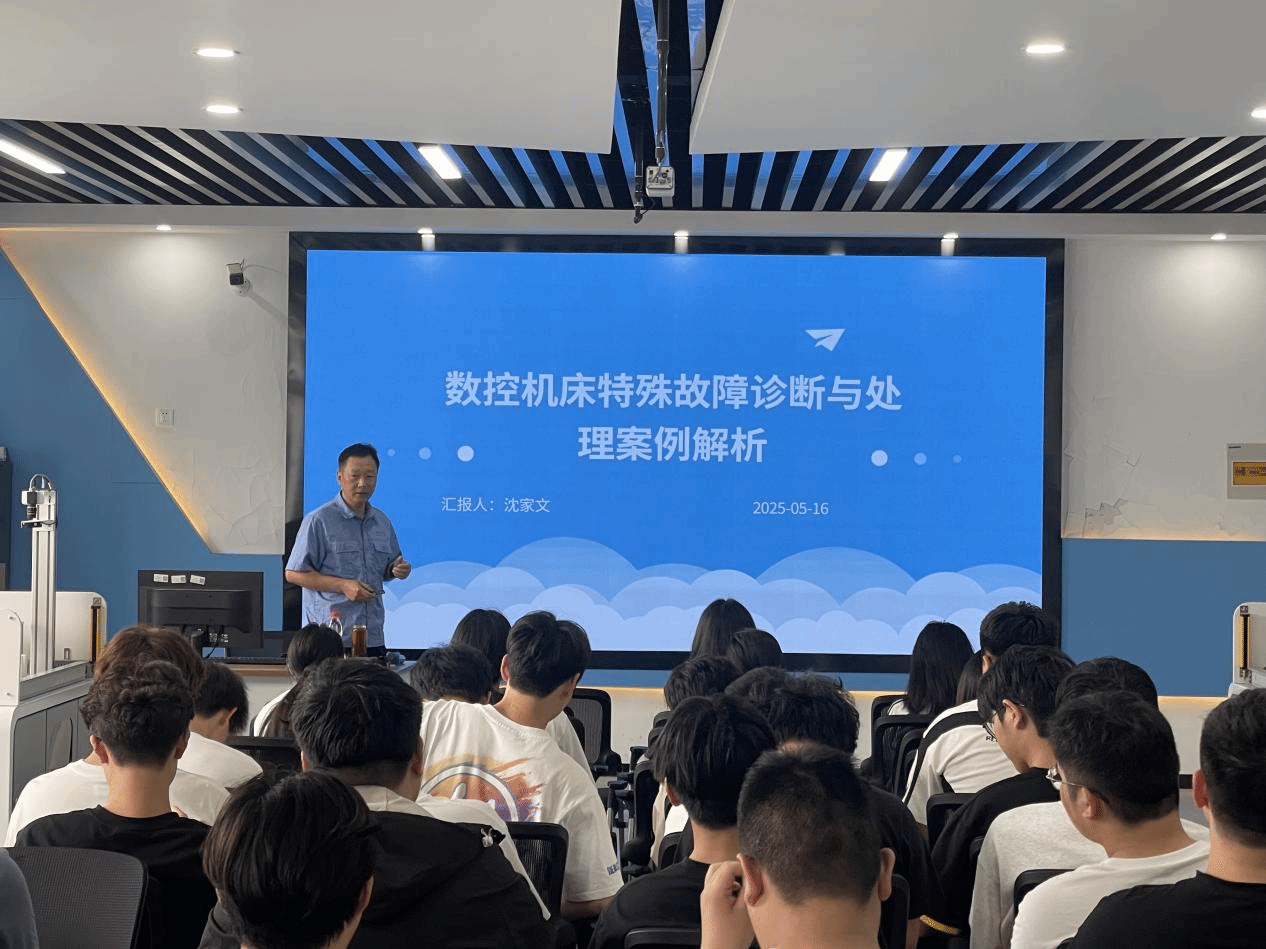 2025年5月16日为深化产教融合,提升人才培养质量和专业建设水平,电气工程学院特邀安徽省技能大师、省级产业教授、高级技师沈家文来校开展《数控机床特殊故障诊断与处理案例解析》专题讲座。本次活动由电气工程学院主办,吸引了60余名师生参与。