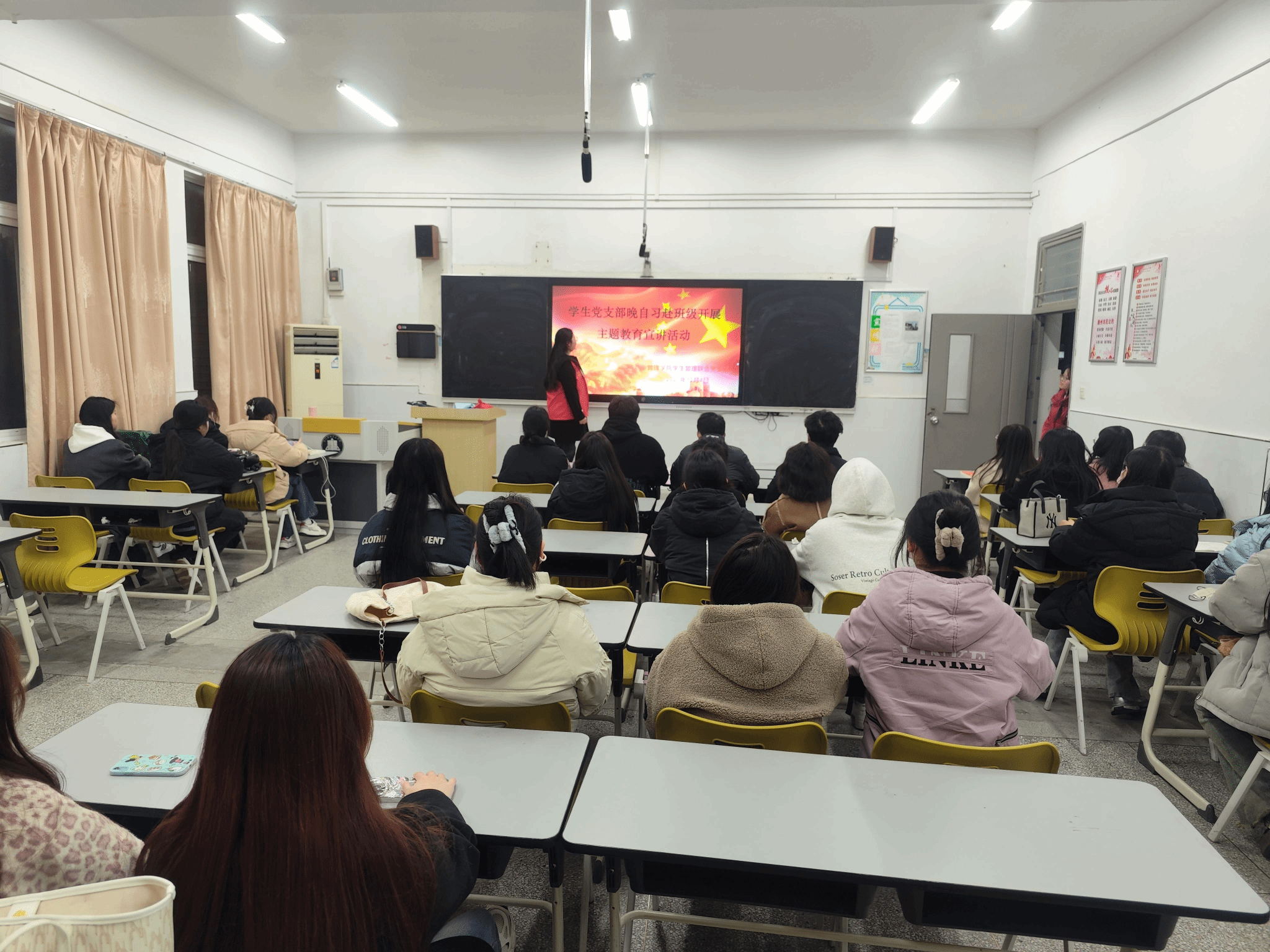为深入学习贯彻习近平新时代中国特色社会主义思想,推进主题教育走深走实,发挥学生党员的先锋模范作用,我院学生管理联合党支部组织学生党员宣讲团于2023年11月14日赴学生晚自习室开展主题教育宣讲活动。