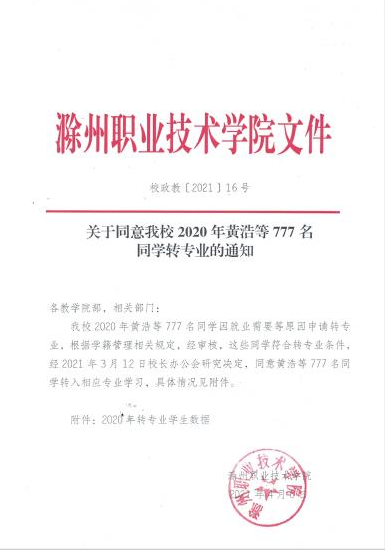 关于同意必赢官网2020年黄浩等777名转专业的通知 校政教〔2021〕16号