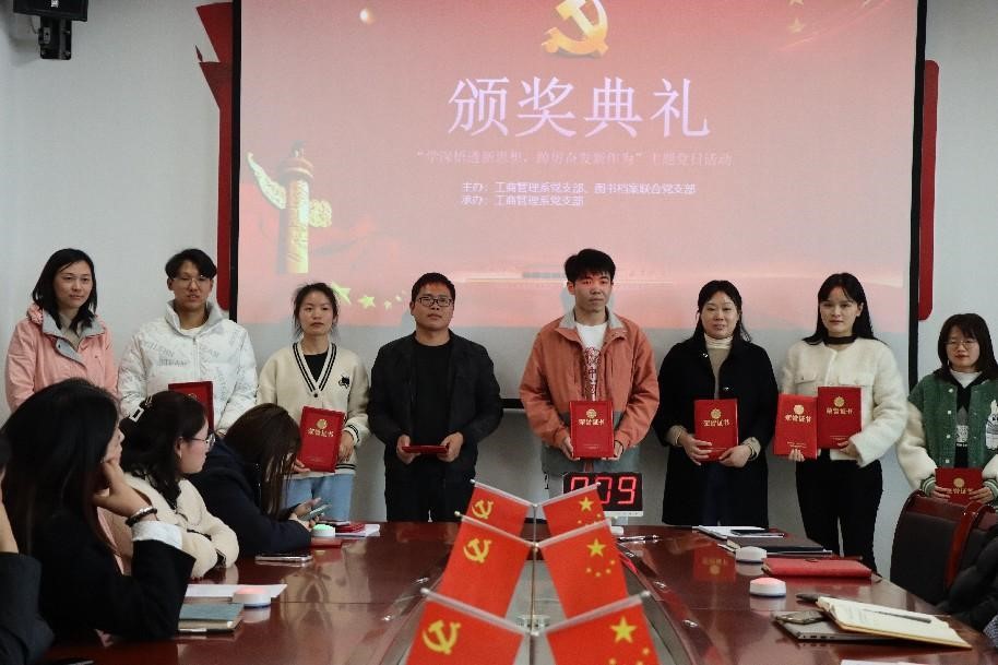 为深入学习习近平新时代中国特色社会主义思想,全面贯彻党的二十大精神,把党的二十大提出的一系列战略部署“内化于心、外化于行”,营造“比学赶超”的学习氛围。2023年2月28日下午,工商管理系党支部、图书档案联合党支部在工商管理系党员活动室(A1-410)举行了“学深悟透新思想,踔厉奋发新作为”主题党日活动,教师党员、学生党员共同参与此次活动。