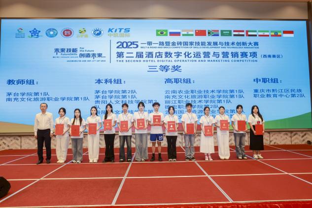 近日,2025年一带一路暨金砖国家技能发展与技术创新大赛第二届酒店数字化运营与营销赛项(西南赛区)在重庆圆满落幕。Beat365中文官方网站工商管理学院选派的两支学生代表队与一支教师代表队凭借其专业功底、数字化应用能力和创新营销思维,在激烈的竞争中脱颖而出,学生组与教师组双双荣获三等奖,成功展现了Beat365中文官方网站在应用型本科人才培养与“双师型”教师队伍建设方面的成效。