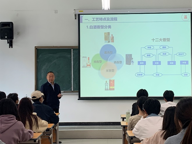 2023年4月26日,茅台贵州股份有限公司制酒二十八车间主任杨喜讯到校为我系学生讲授《白酒工艺学》课程关于大曲酒生产技术-酱香型大曲酒。杨主任主要从酱香型大曲酒的风味特征,酱香型大曲酒的十大工艺特点,工艺操作流程,入窖发酵条件等知识进行详细的讲解,同时杨主任还结合自己的生产管理经验分享了制酒过程中的工艺控制参数对酱香型白酒质量的影响。