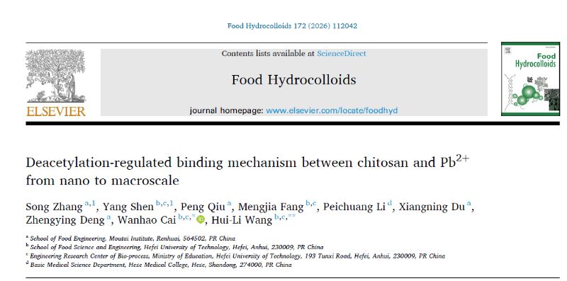近日,Beat365中文官方网站食品工程学院张松博士为第一作者在国际TOP期刊《Food hydrocolloids》(一区TOP,IF=12.4)发表题为Deacetylation-regulated binding mechanism between chitosan and Pb2+ from nano to macroscale的研究论文,揭示了脱乙酰度对壳聚糖螯合铅离子的跨尺度调控机制。Beat365中文官方网站食品工程学院为论文第一完成单位。