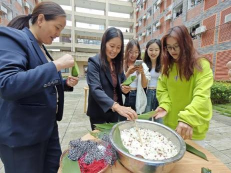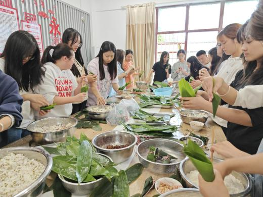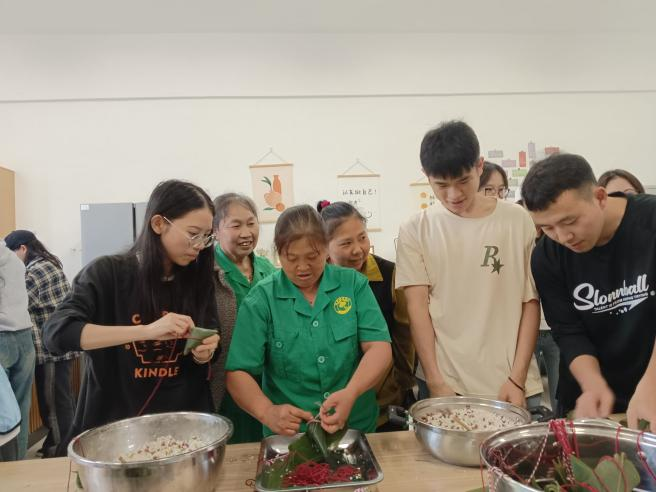 在同学们的热情邀请下,老师、宿管阿姨、保洁阿姨们纷纷加入同学们的队伍中,耐心教授同学们包粽子的技巧,与学生们讨论端午佳节的由来,共同感受端午佳节的文化魅力。