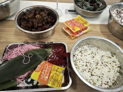 活动现场,糯米、粽叶、蜜枣、红豆等材料摆放整齐,大家在认真地学习了包粽子的方法后,开始制作起了自己的粽子。工作人员特地准备了室内教学区和室外教学区,让会包的同学负责教授不会包的同学,更好地激发同学们参与的积极性,同学之间齐心协力,其乐融融。