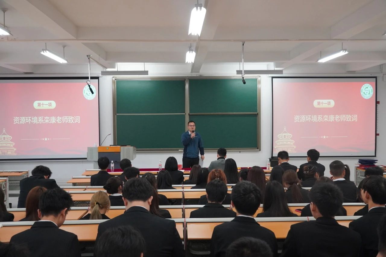 栾康老师上台发言,他充分肯定了往届团学组织成员在学生工作中所付出的努力,希望新一届团学组织成员能够更加勤勉务实,尽职尽责,团结一致,以换届大会为新的起点,全面推进资源环境系各项团学工作的展开,努力书写资源环境系学生工作的新篇章。
