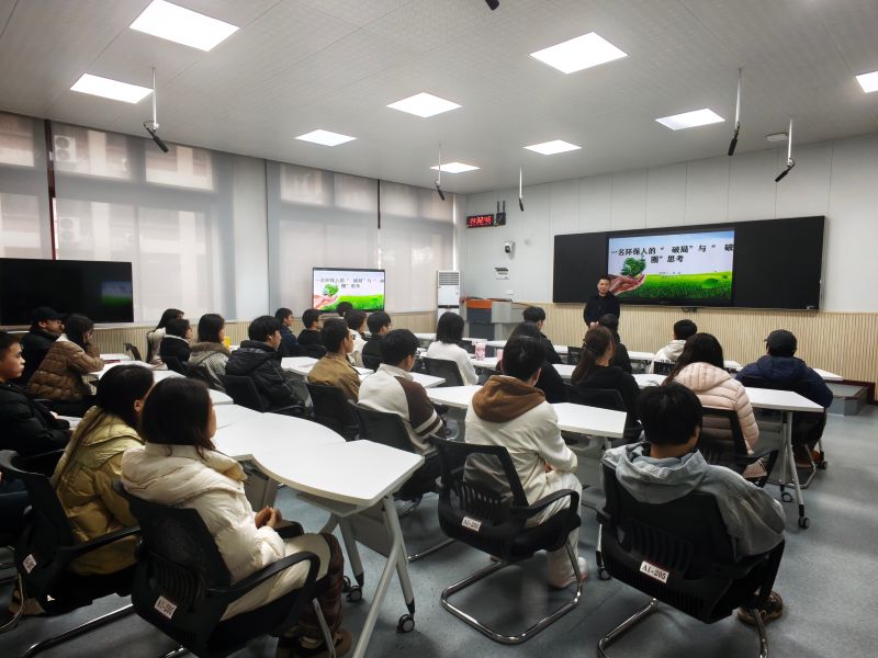 课堂上,同学们认真聆听,积极思考。张磊指出,当前生态文明建设进入纵深阶段,环保从“治标”迈向“治本”,需要更多具备创新思维与实践能力的青年力量参与。他鼓励资环学子以“知行合一”的态度,积极投身绿色产业,勇于破除思维定势和专业边界,在实践中不断成长为“懂技术、会管理、有担当”的新时代环保人才。