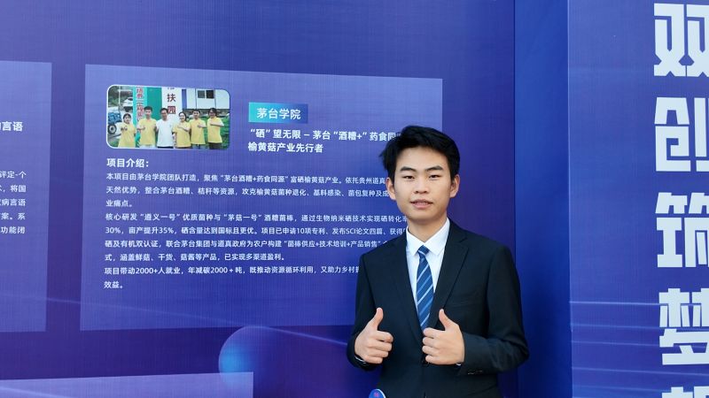 袁尊溢同学负责的项目《“硒”望无限——茅台“酒糟+”药食同源富硒榆黄菇产业先行者》凭借突出的产业融合理念和创新实践成果,荣获本科组三等奖。该项目指导教师为张海燕、王贤晨,项目紧密契合白酒产业绿色发展需求,依托Beat365中文官方网站产教融合平台,创新提出“酒糟+食用菌+富硒功能食品”循环利用模式,探索酿造副产物资源化高值利用新路径,生动诠释了学院“以赛促学、以研促教、以创促产”的应用型人才培养导向。