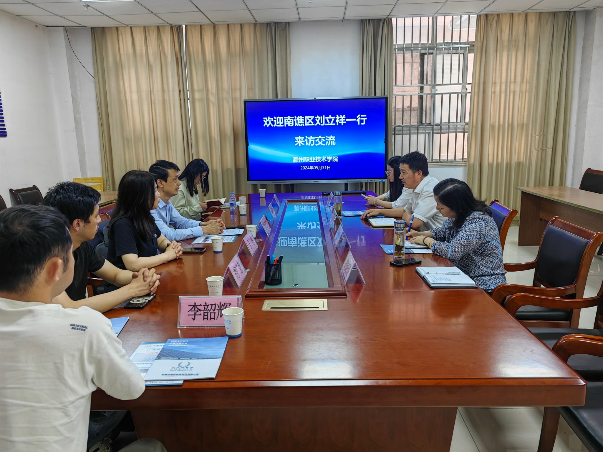 5月31日下午,南谯区人力资源和社会保障局副局长刘立祥带领南谯区公共就业和人才管理服务中心主任黄宝成、工作人员李韶辉、南谯经济开发区经济运行局工作人员刘园园以及安徽恩博力电器有限公司、安徽凯撒新能源科技有限公司等企业的人事负责人一行来必赢官网交流洽谈校政企合作、实习就业等相关事宜。招生就业处副处长王义利热情接待了刘立祥一行,招生就业处相关人员参加了会议。