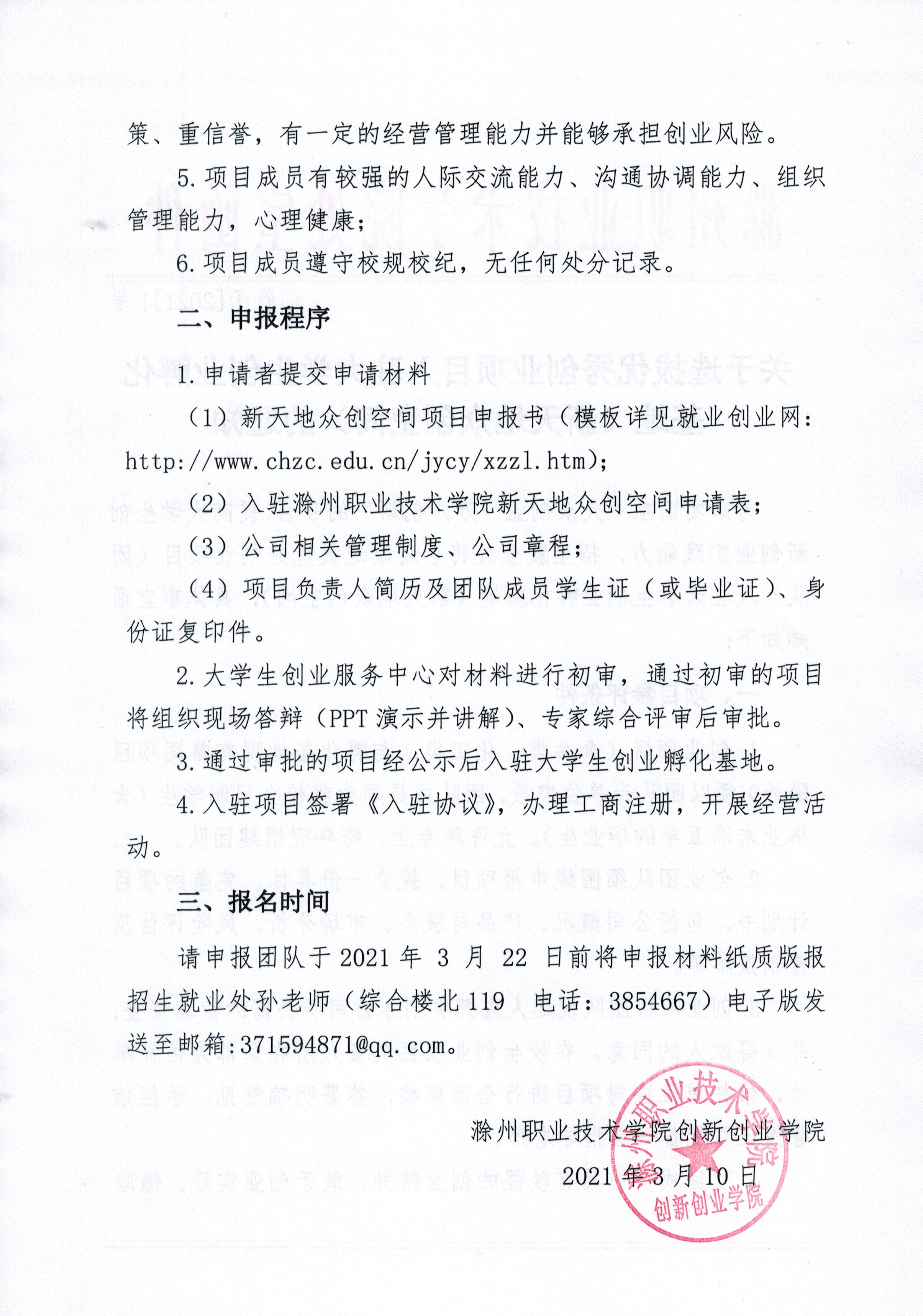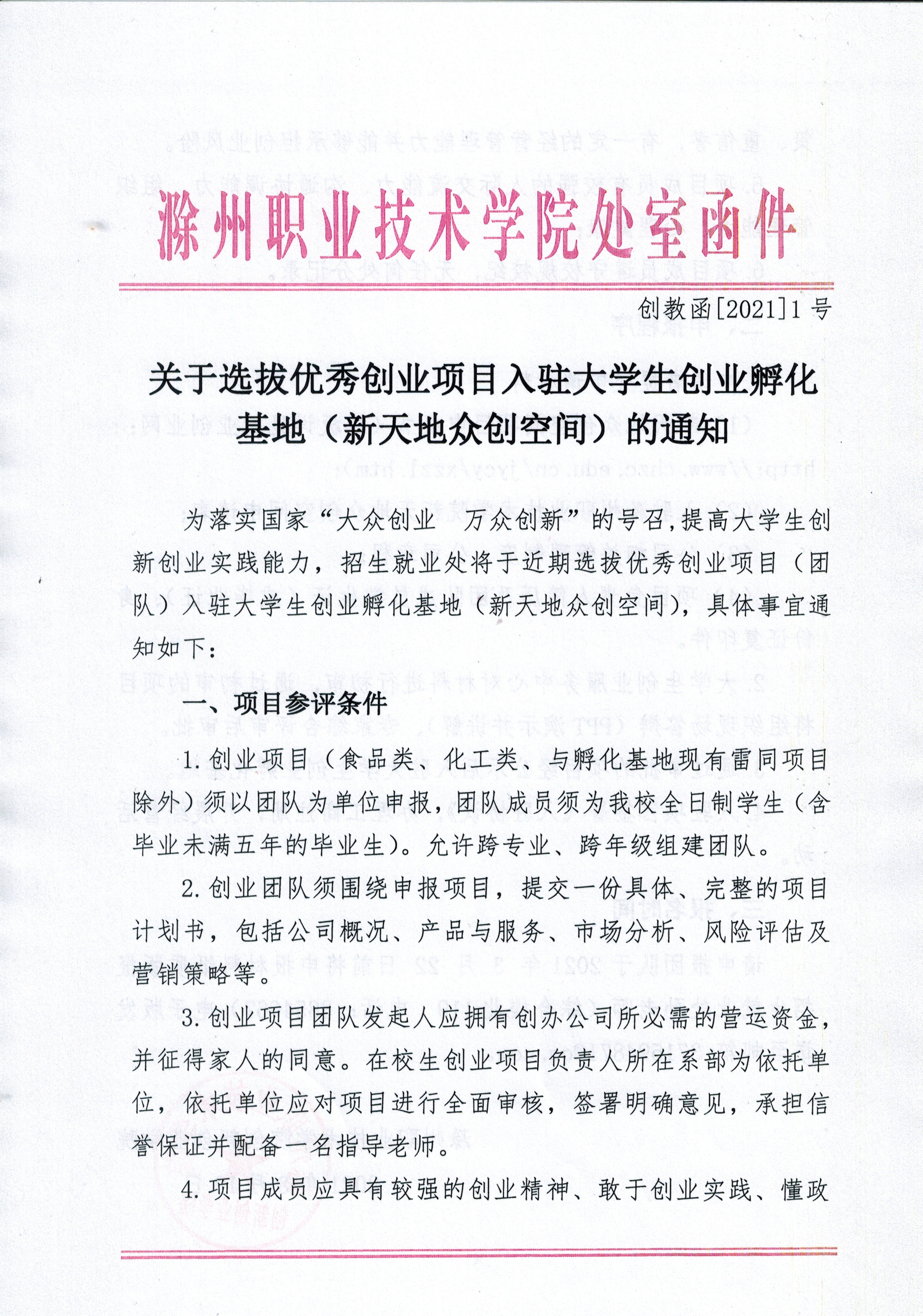 关于选拔优秀创业项目入驻大学生创业孵化基地(新天地众创空间)的通知
