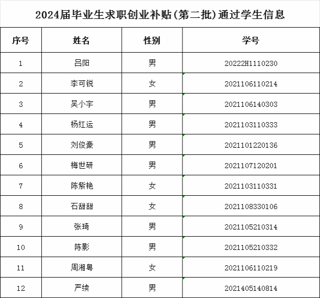 根据省人社厅通知,12月1日-12月15日期间,求职创业补贴申报系统再次面向2024届毕业生开放。经毕业生本人申请,省人社厅等7部门审核,吕阳等12人通过,现予公示,名单附后。
