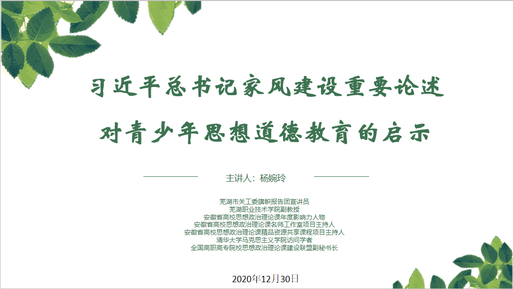 12月30日,马克思主义学院邀请芜湖职业技术学院马克思主义学院杨婉玲院长在超星学习通为2019级近300名学生作了“习近平总书记家风建设重要论述对青少年思想道德教育的启示”专题讲座。