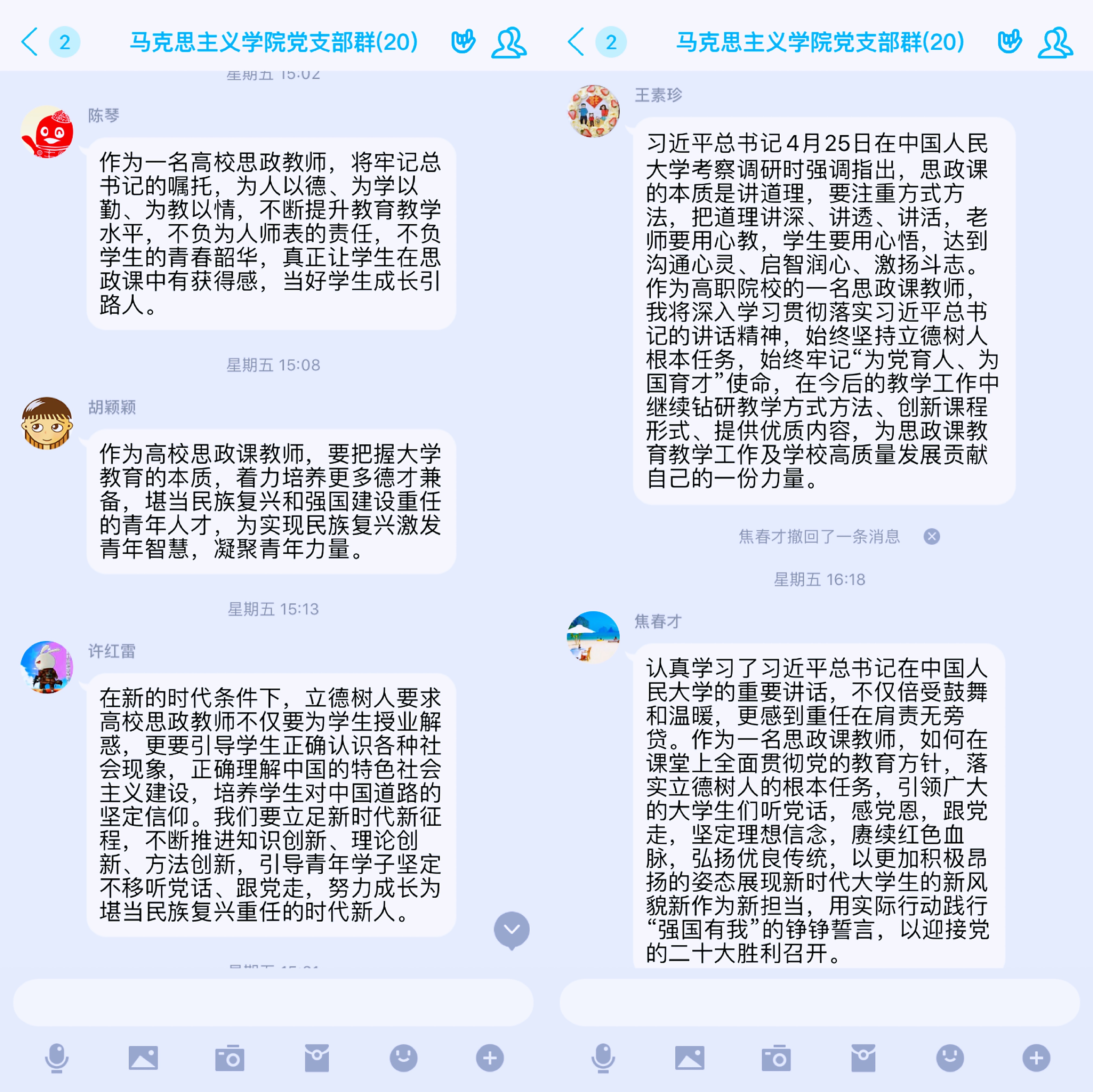 五四青年节到来之际,4月25日上午,习近平总书记来到中国人民大学考察调研,在人大立德楼观摩思政课智慧教室现场教学并参与讨论,同师生代表座谈并发表重要讲话。4月29日下午,马院支部全体党员老师在线上QQ群,在线学习了习近平总书记在中国人民大学考察时的重要讲话精神,全体教师就学习习近平总书记人大考察重要讲话精神的思考和体会进行深入交流。
