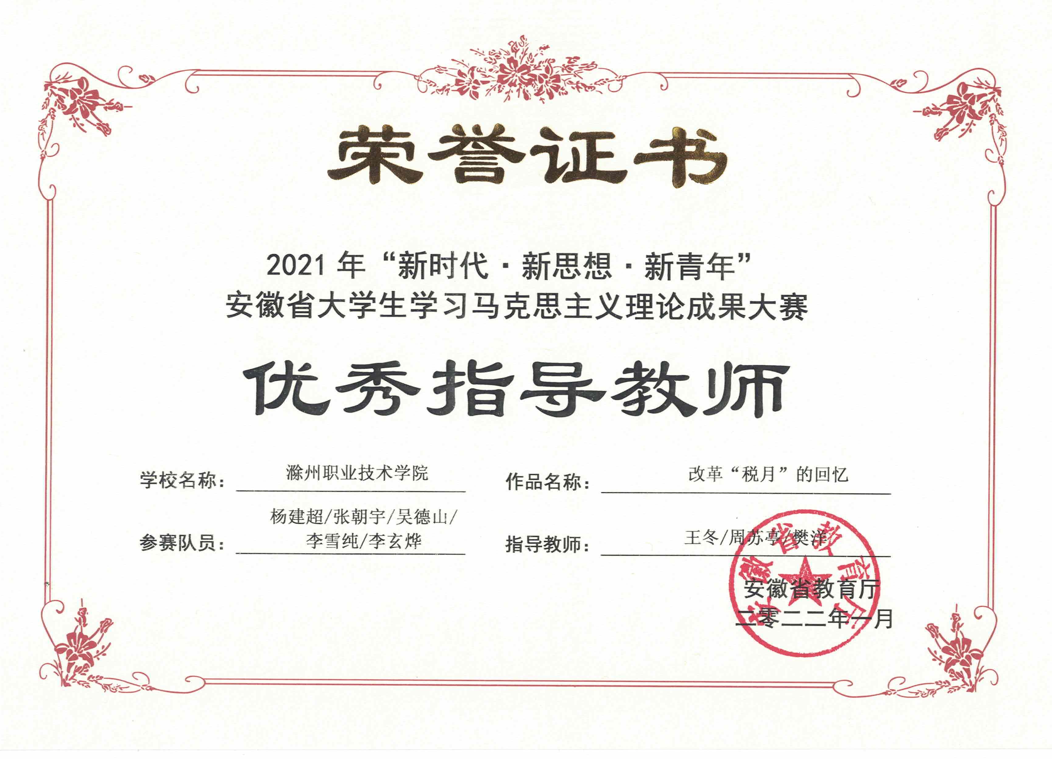 为深入贯彻落实习近平总书记在学校思想政治理论课教师座谈会上的重要讲话精神,积极构建与课堂教学相互促进的思政理论课第二课堂教学体系,马克思主义学院专职教师王冬、兼职教师樊洋师指导学生参加2021年“新时代·新思想·新青年”安徽省大学生学习马克思主义理论成果大赛创佳绩,在微视频赛项中,斩获一等奖第一名1项、二等奖1项,2人获优秀指导教师奖。