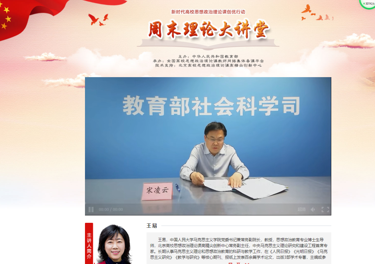 5月6日全国“周末理论大讲堂”邀请中国人民大学王易教授做主讲嘉宾,她与我们分享了习近平总书记走进思政课智慧教室、同青年学生一起认真倾听并参与讨论的现场故事,从思政课教师的视角解读习近平总书记重要讲话精神,并对如何学习贯彻重要讲话精神进行探讨。本次学习活动是教育系统深入学习贯彻习近平总书记在中国人民大学考察时重要讲话精神工作的一项“规定动作”。马克思主义学院组织全体专兼职教师进行线上学习。