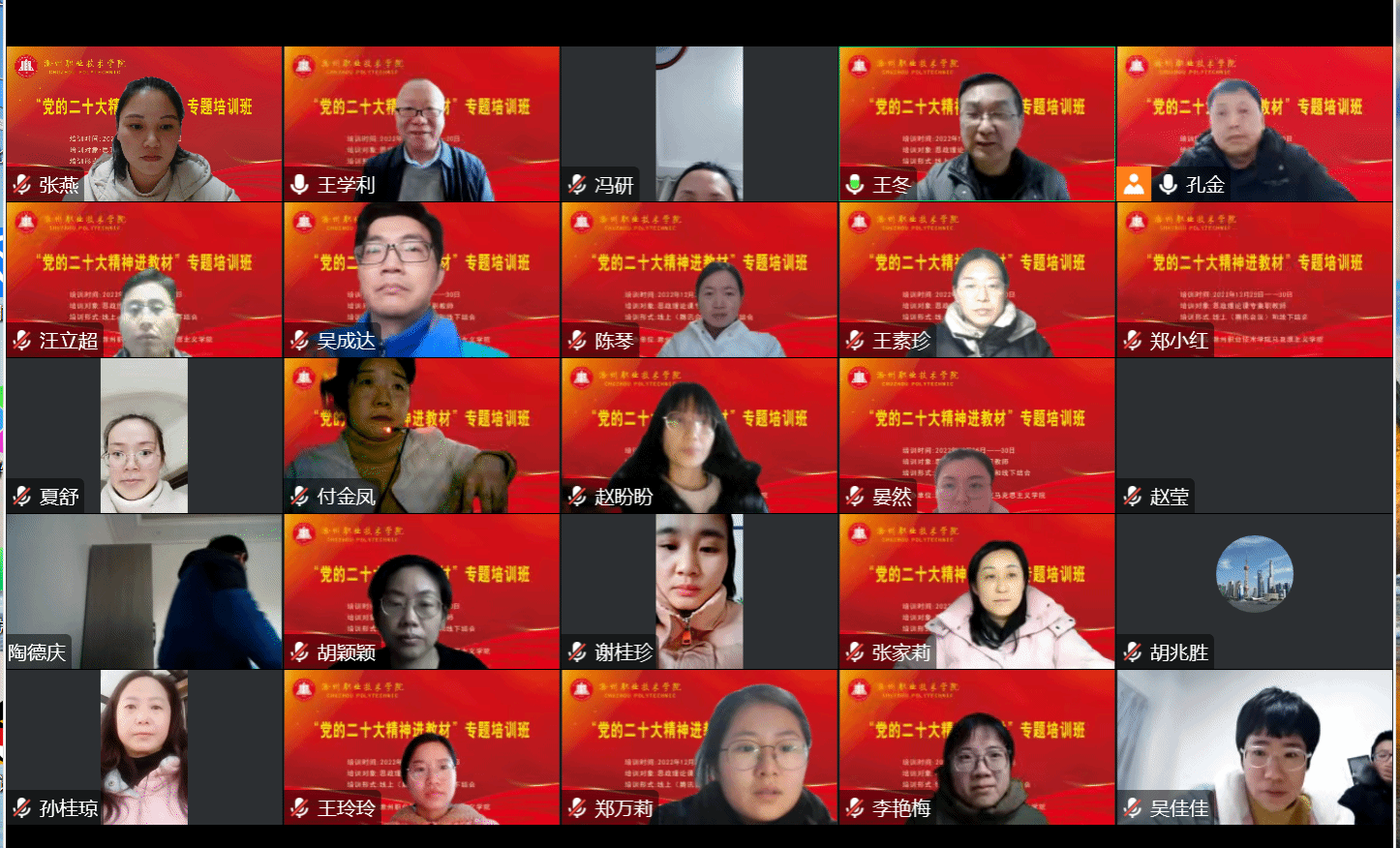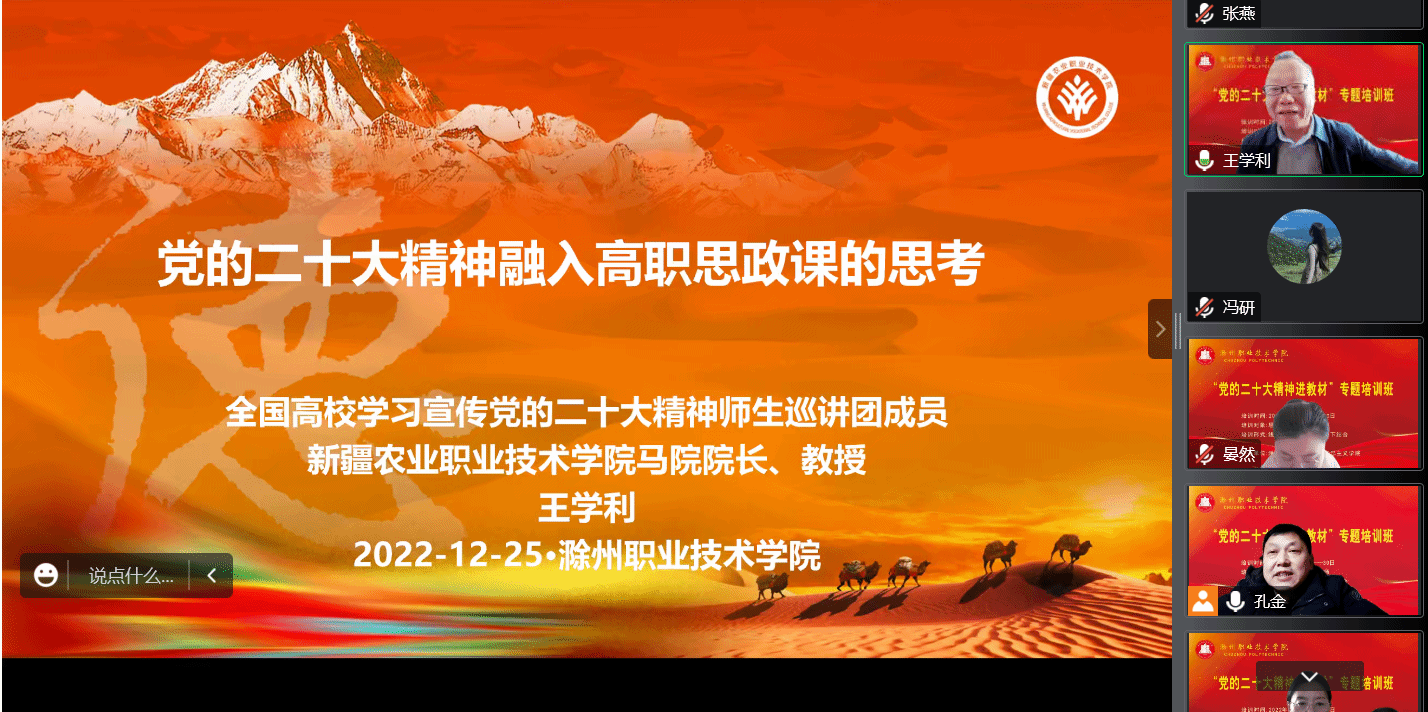 根据安徽省教材委员会办公室转发国家教材委员会办公室关于做好党的二十大精神进教材工作的通知要求,现举办必赢76net线路官网习近平新时代中国特色社会主义思想和党的二十大精神进教材专题培训班。12月25日,新疆农业职业技术学院马克思主义学院院长、教授王学利受邀做第一场专题辅导《党的二十大精神融入高职思政课的思考》,线上会议由马克思主义学院副院长孔金主持,全体专兼职思政教师参加。
