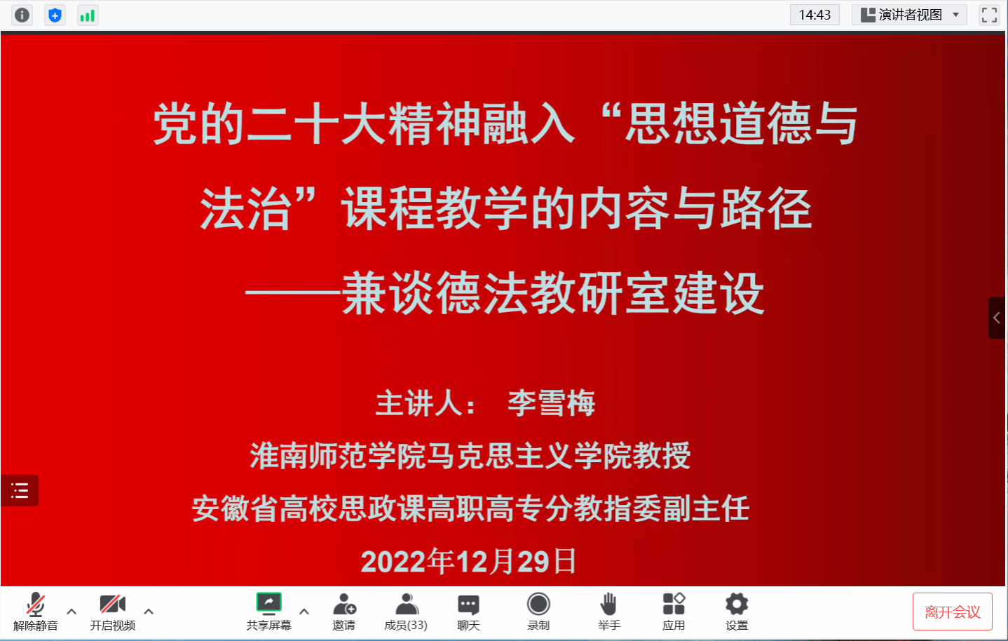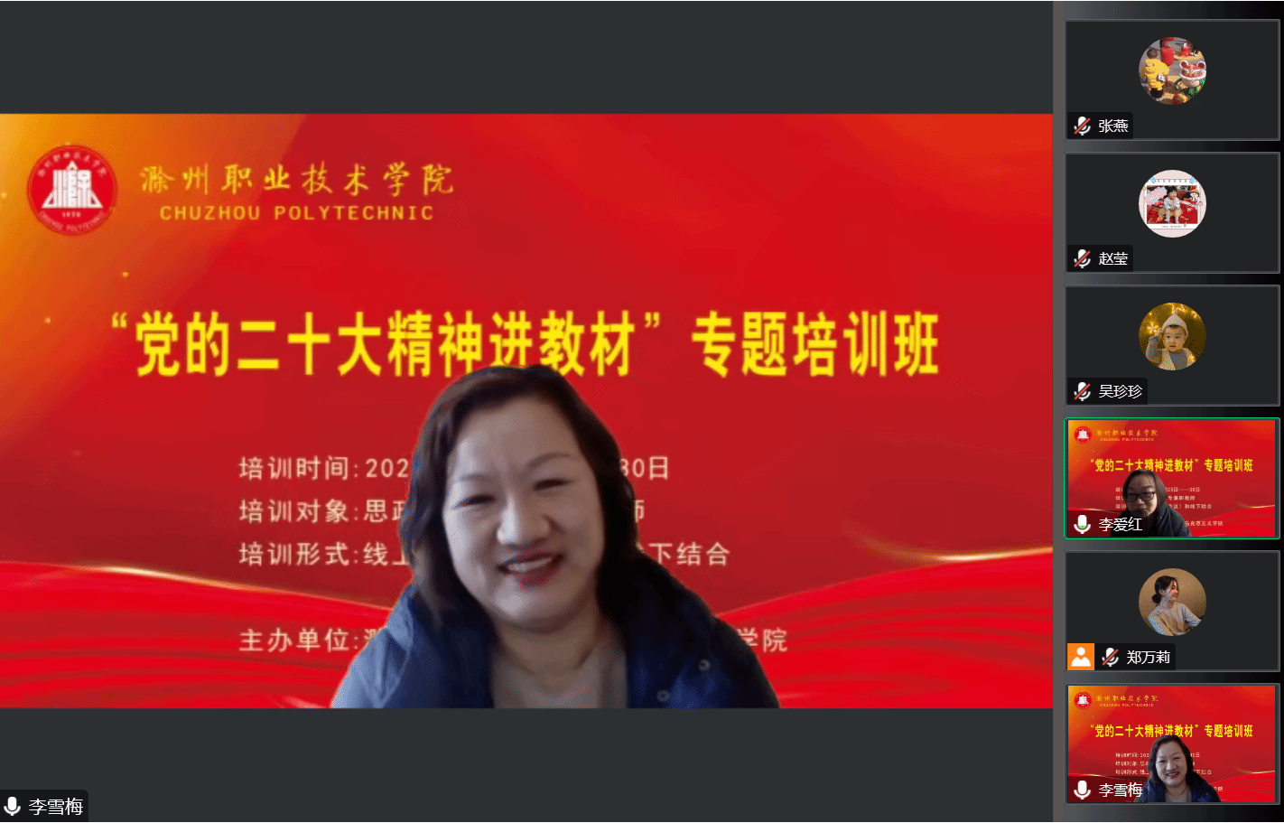 必赢76net线路官网习近平新时代中国特色社会主义思想和党的二十大精神进教材专题培训正在有条不紊的进行中,12月29日上午,淮南师范学院马克思主义学院教授李雪梅受邀做第五场专题辅导《党的二十大精神融入“思想道德与法治”课程教学的内容与路径》,线上会议由马克思主义学院院长李爱红主持,全体专兼职思政教师参加。