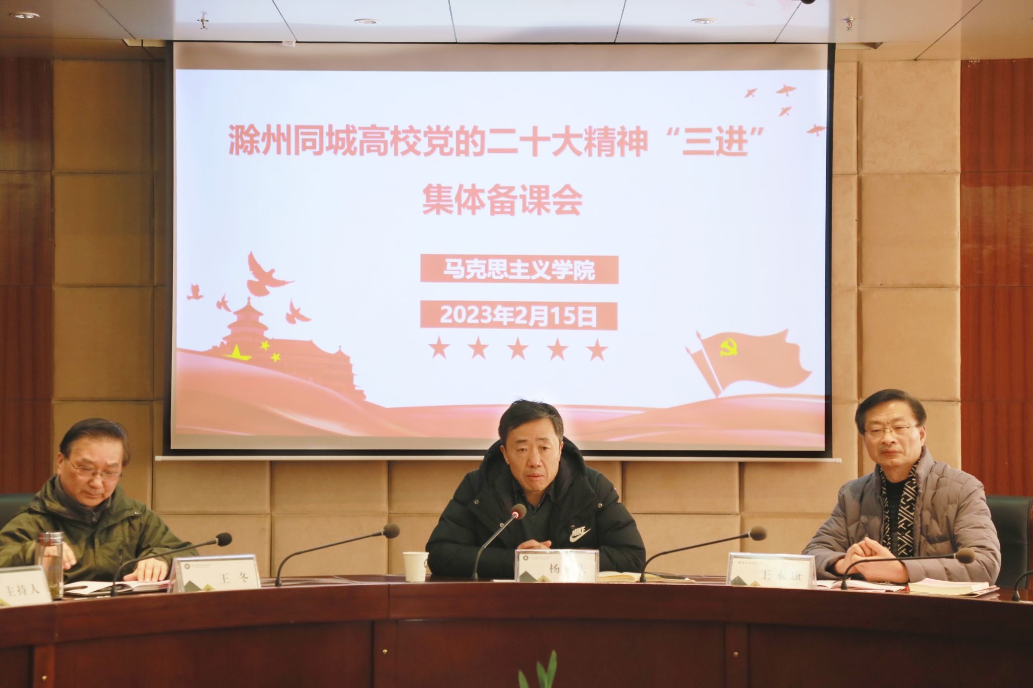 为了帮助思政课教师加深对党的二十大精神的理解和把握,进一步推进将党的二十大精神融入思政课程,2月15日,马克思主义学院牵头组织滁州同城高校党的二十大精神“三进”集体备课会,主题为“中国式现代化理论与实践融入高校思想政治理论课教学”。备课会邀请到滁州市委党校副校长王永康与会梳理点评,滁州学院马克思主义学院党总支副书记、副院长张静、滁州城市职业学院马克思主义学院党总支书记、院长季金年带队参加备课会。必赢官网党委副书记杨家庆、党委委员、基础部主任王冬出席会议并讲话。会议由马克思主义学院副院长孔金主持,地点在综合楼1102会议室,同城高校80余名思政课教师与会。