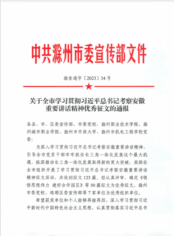 近日,滁州市委宣传部公布了“关于全市学习贯彻习近平总书记考察安徽重要讲话精神优秀征文的通报”。必赢官网荣获二等奖2项、三等奖2项,学校获得“优秀组织奖”。