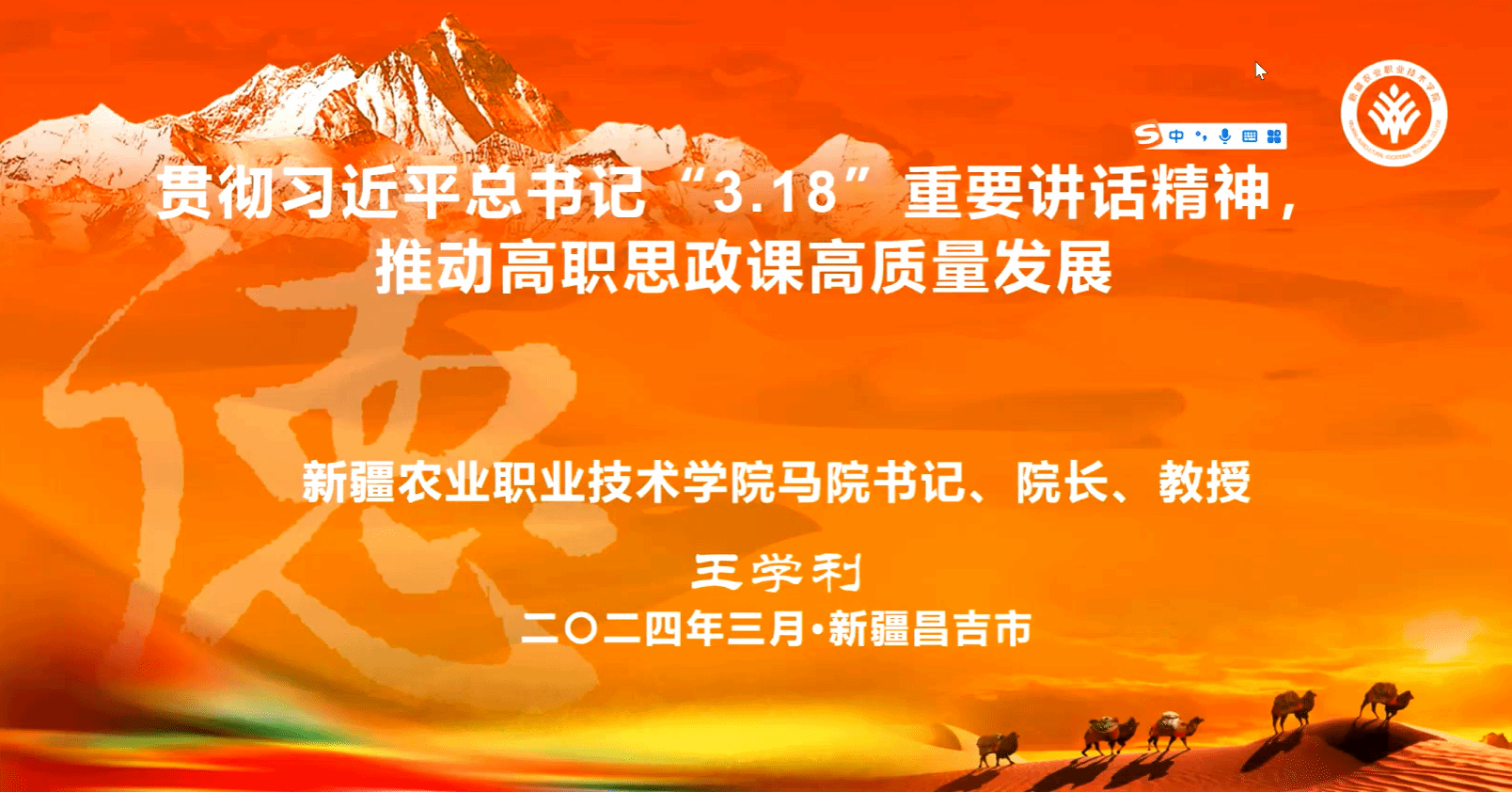 为更好地贯彻落实习近平总书记关于思政课建设的重要讲话精神,推进思政课建设改革创新,在学习贯彻落实“3·18”重要讲话精神五周年之际,3月11日,必赢官网马克思主义学院邀请新疆农业职业技术学院马克思主义学院党总支书记、院长王学利在综合楼309会议室在线开展了题为“贯彻习近平总书记‘3·18’重要讲话精神,推动高职思政课高质量发展”的专题报告,继续推动“名师进校园”活动。本场讲座由马克思主义学院党总支书记、院长孔金主持,全体专兼职教师参加。