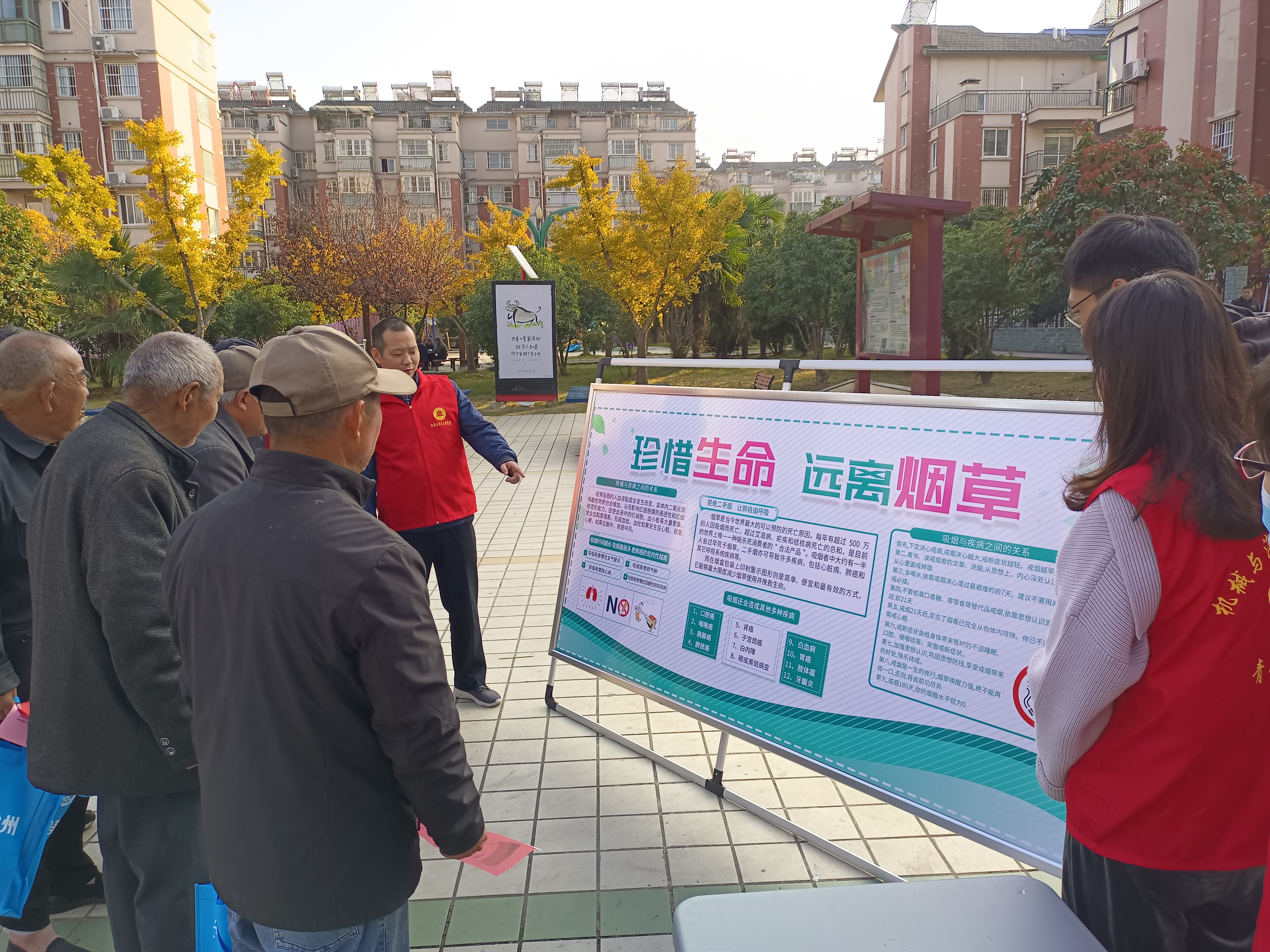 活动现场,志愿者们选择人流量最密集的广场区域。通过悬挂宣传横幅、摆放“珍惜生命、远离烟草”宣传展板、设立知识宣传咨询台、向群众散发远离烟草倡议书等方式积极开展宣传,同时为前来的群众送上小礼品并耐心的为其讲解吸烟的危害,志愿者们热诚的服务得到社区居民的一致好评。