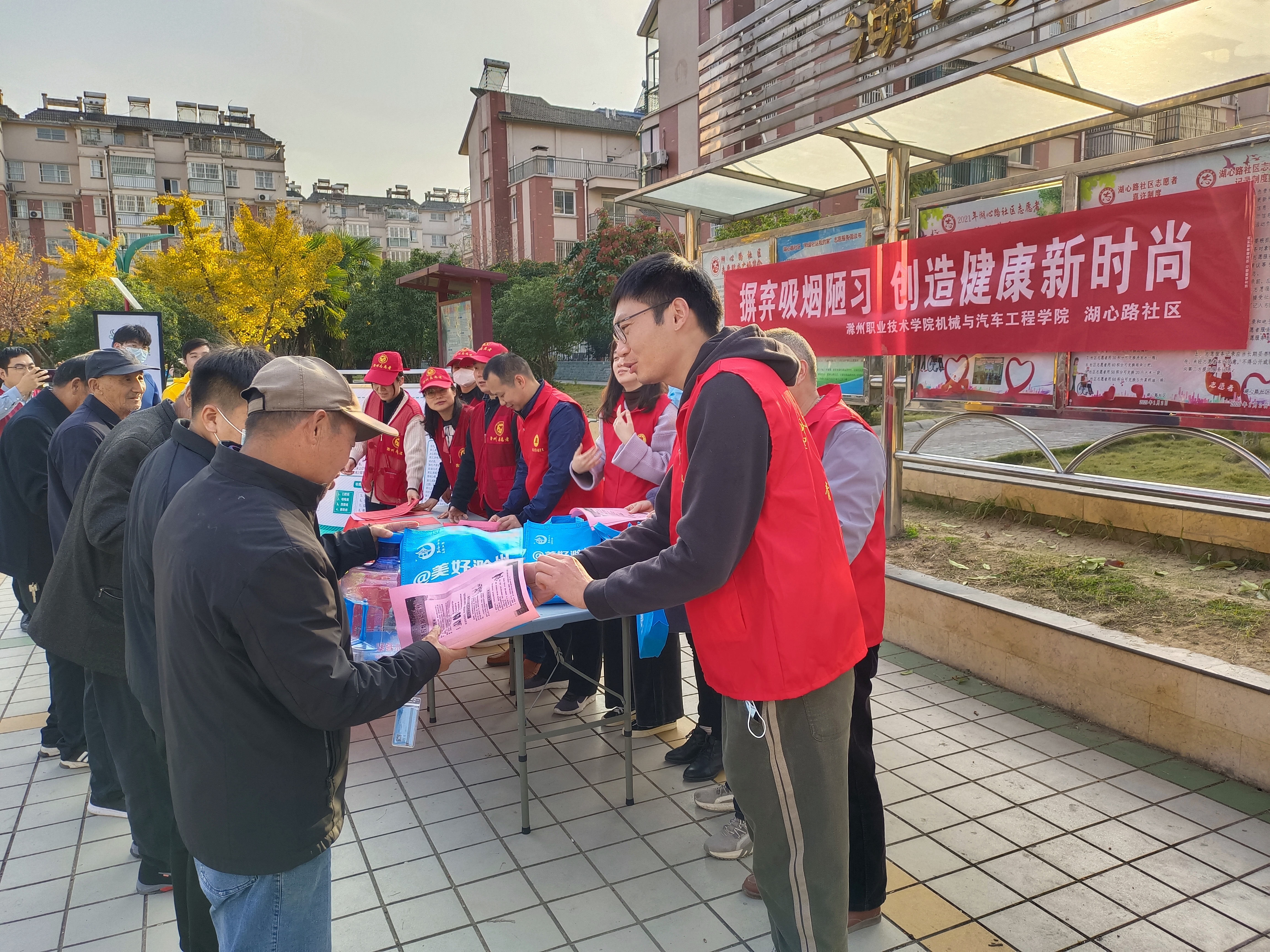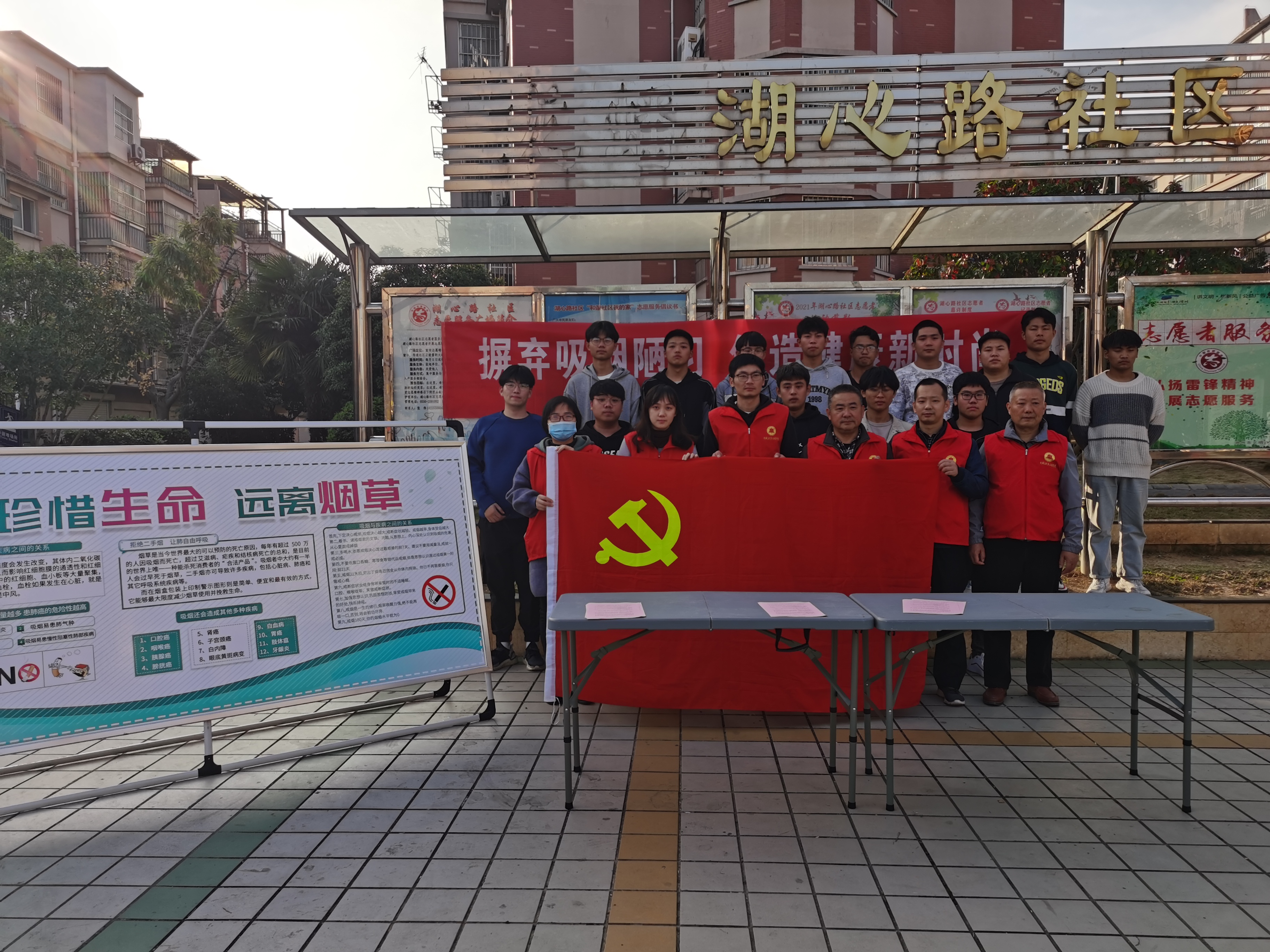 为庆祝中国共产党成立100周年,发挥教职工党员先锋模范作用,2021年 11月19日下午,机械与汽车工程学院党员志愿者带领我院部分学生入党积极分子赴湖心路社区开展“摒弃吸烟陋习,创造健康新时尚”主题志愿活动。
