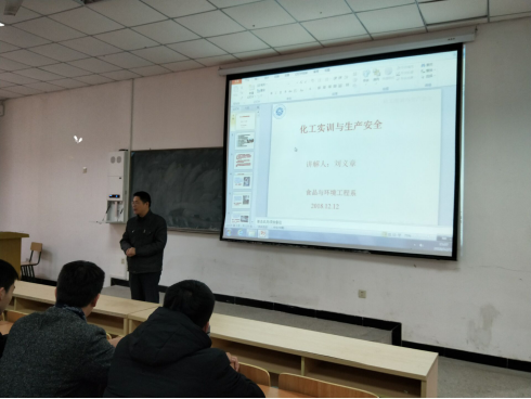 2018年12月12日下午15:00,食环系刘义章副教授在南阶103教室举办了“化工实训与生产安全”学术讲座。食品与环境工程系2017级的全体学生及全院感兴趣的部分师生参加了此次讲座。